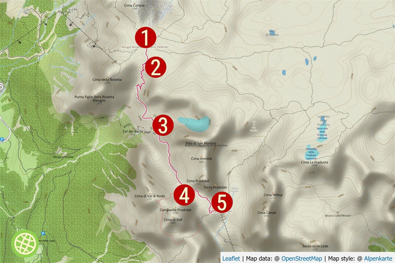 Startpunkt/Abbruch/Einstieg: Das Rifugio di Rosetta ist mit der Seilbahn und zu Fuß erreichbar und befindet sich am Ende der Tour 42. Endpunkt: Das Rifugio Pradidali ist nur zu Fuß erreichbar und befindet sich am Anfang der Wanderung 44.