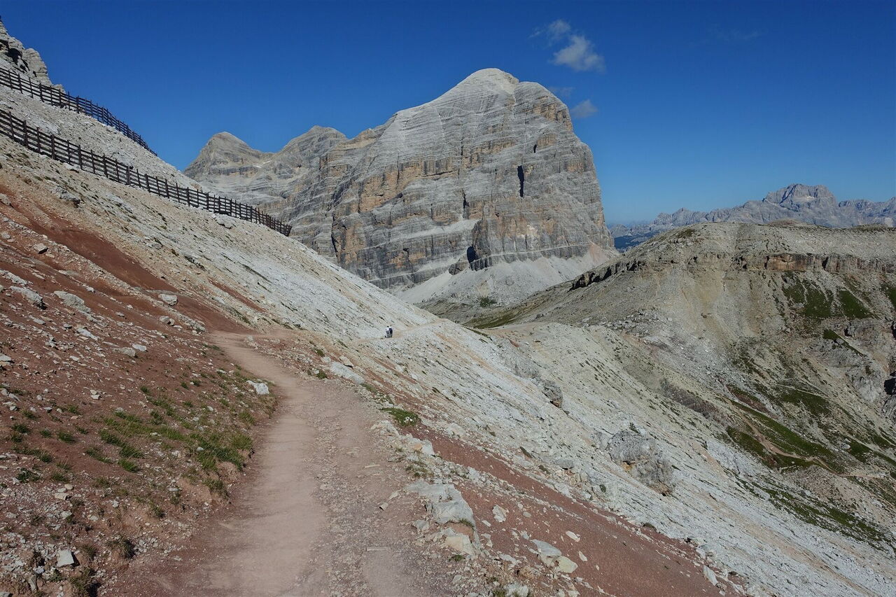 Vom 01 Rifugio Lagazuoi (2.778 m) gehen wir die wenigen Meter zur Seilbahnstation herunter und folgen dann dem mit Holzpfählen befestigten Wanderweg 20. Es geht vorbei an Stellungen aus dem Ersten Weltkrieg und weiter bis zur Forcella Lagazuoi. Bei dieser kleinen Einsattelung gehen wir wenige Meter geradeaus bergauf und folgen dann dem weiterführenden Wanderweg 20 B. Der Pfad führt in Richtung der mächtigen Westwand der Tofana di Rozes. Es geht parallel zu Metallgerüsten zur Lawinensicherung bis zum 2.507 m hohen Forcella Travenanzes.