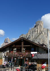 Sobald wir wieder Bergwiesen erreichen, wird der Pfad zum breiten Wanderweg. Vor einem großen Haus mündet von scharf links der Wanderweg 444 in den unsrigen. Dieser kommt vom Rifugio Cinque Torri und dem Klettersteig Via Ferrata Ra Gusela (Wanderweg 438). Auf dem breiten Wanderweg geht es bequem zum 05 Passo Giau (2.236 m) mit dem gleichnamigen Berggasthof.