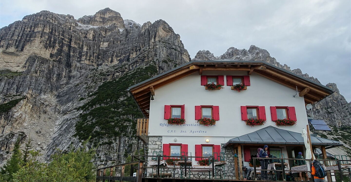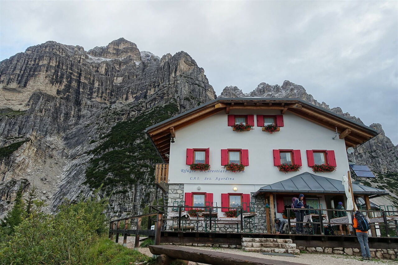 Unterhalb der 2.413 m hohen Pala delle Masenade wandern wir durch weitere Geröllfelder und mit Latschenkiefern bewachsene Berghänge. Auf einem aussichtsreichen Felsvorsprung erreichen wir das 05 Rifugio Bruto Carestiato (1.834 m).