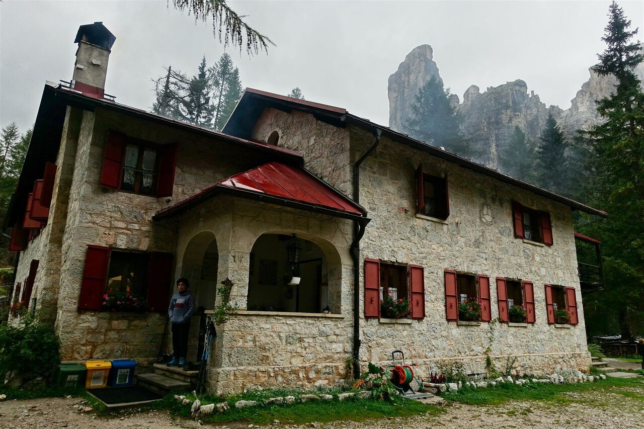 Wir verlassen das 01 Rifugio Vazzolèr (1.714 m) in nordöstlicher Richtung auf der Schotterpiste. Der Wanderweg 555/560 Richtung Rifugio Capanna Trieste macht nach ca. 400 m eine scharfe Rechtskurve. Nun wandern wir Richtung Osten, durch die südlichen Ausläufer des Tales Val dei Cantoni und entlang der imposanten Südwestwand des 2.485 m hohen Torre Trieste.