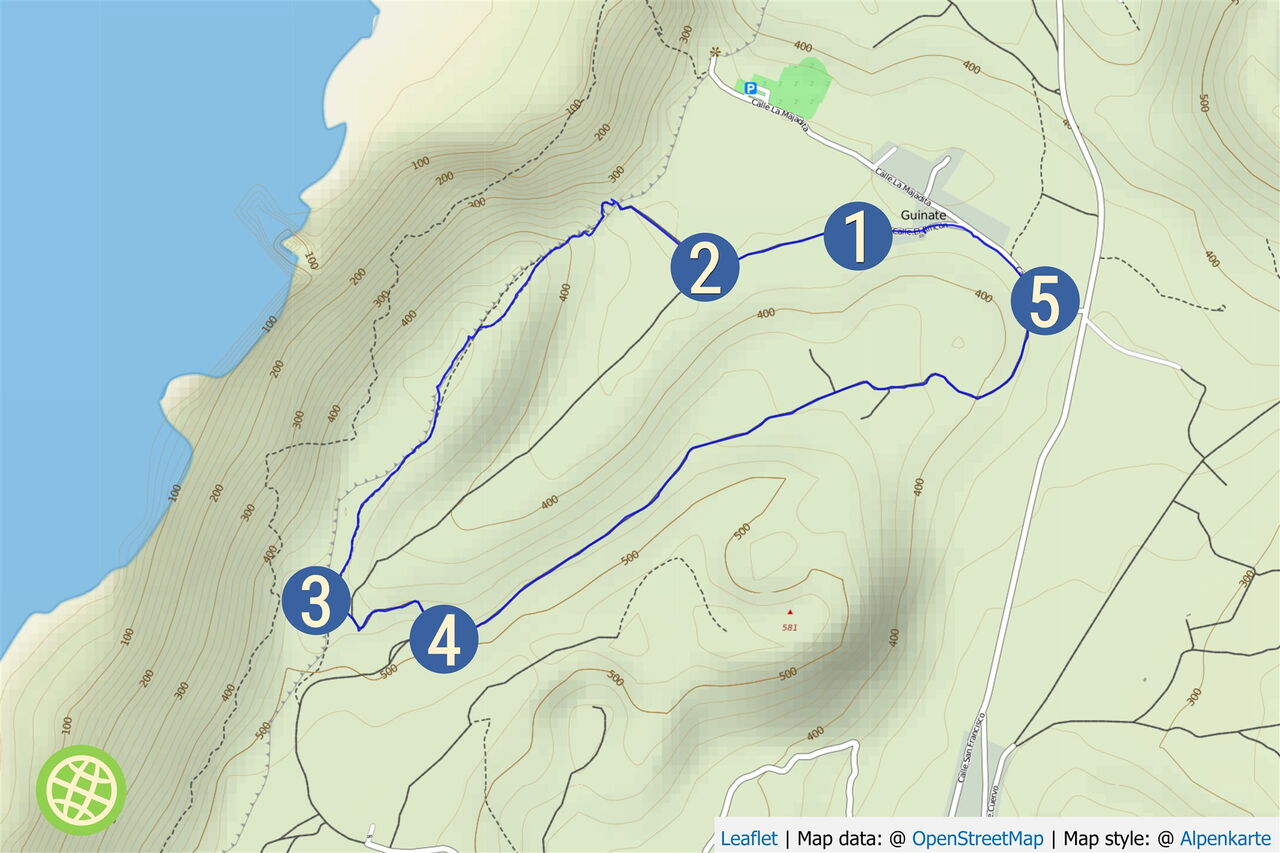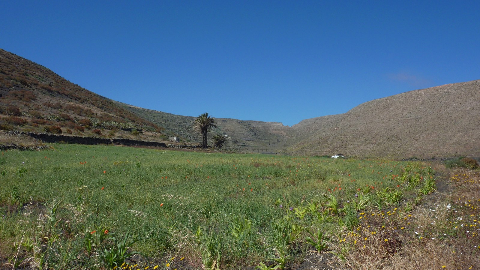 Diese Wanderung führt uns in den Nordwesten von Lanzarote in das Hochtal Valle de Guinate. Als Höhepunkte erwarten uns: eine spektakuläre Gratwanderung, Pfade durch terrassenförmig angelegte Felder, der Mirador mit seinen 475 m senkrecht abfallenden Klippen, Informationstafeln der Inselregierung und das letzte Teilstück auf einem Höhenweg. Im Frühjahr oder nach kräftigen Regenfällen über mehrere Tage ist das Hochtal mit Blumen übersät und besonders schön anzusehen.