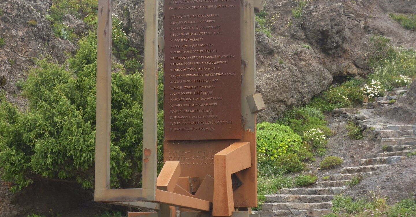 Vom (01) Start und Ziel am Roque de Agando (1064 m) queren wir die GM-2 hinüber zum Denkmal für die Verunglückten durch Waldbrände. Wir befinden uns an der Carretera dorsal, der großen Verbindungsstraße zwischen der Hauptstadt und den westlichen Inselteilen. Direkt links neben dem Denkmal sehen wir einen Durchlass in der Begrenzungsmauer zu Straße. Hier beginnt der Wanderweg unterhalb der 220 Meter hohen Westflanke des Roque de Agando.