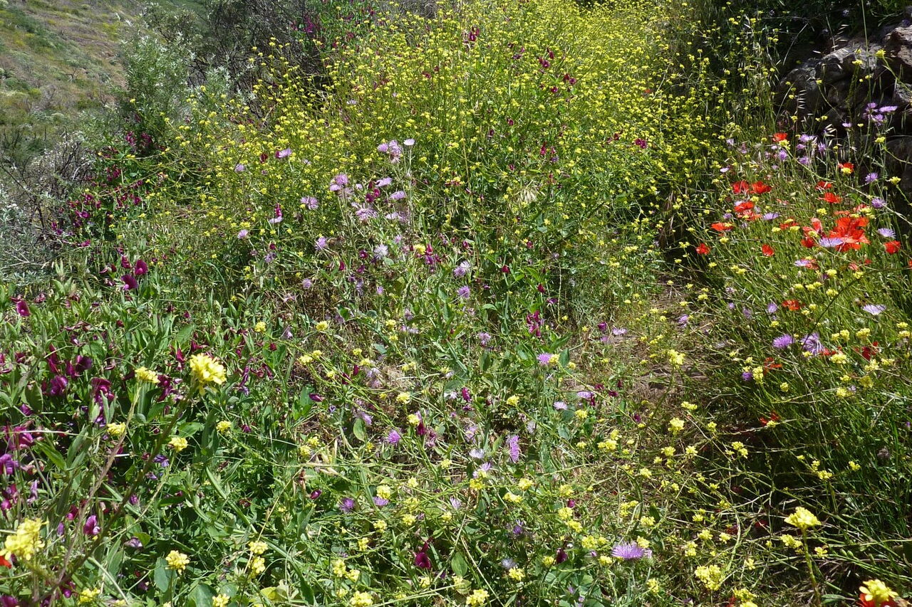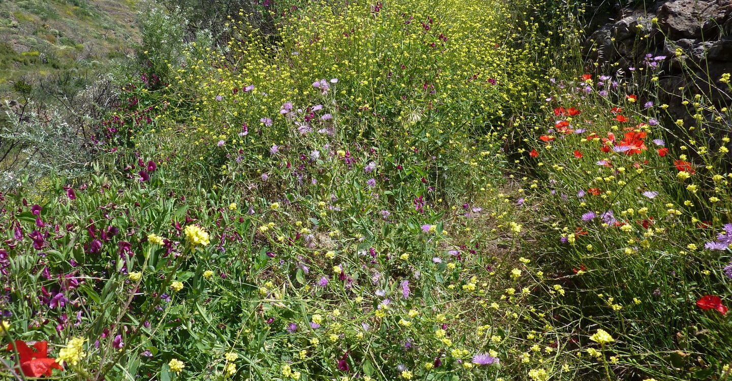Im Frühjahr läuft man in dem folgenden Abschnitt durch ein hüfthohes Blumenmeer. Wir bleiben auf dem Weg, bis wir auf den (04) Imada Abzweiger zwei (1088 m) treffen. Wir ignorieren den Abzweiger nach links und gehen weiterhin geradeaus und bergauf. Auf der Forststraße angekommen, lassen wir den linken Abzweiger liegen und laufen weiterhin geradeaus, bis wir einen markanten Eukalyptusbaum erreichen. An dieser Weggabelung wandern wir halb links, bis wir kurz die GM-2 tangieren und dort halb rechts weitergehen, um nach 20 Metern links den Pfad nehmen. Schon bald erreichen wir den nächsten Höhepunkt - den Mirador de Tajaque. Es eröffnen sich atemberaubende Weitblicke auf die Schlucht von Benchijigua über Alajeró und bis hin zum Playa de Santiago.