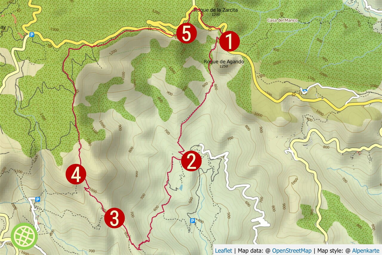 Am Parkplatz des Mirador de Tajaque queren wir die GM-2, um diese nach 400 Metern auf einer Brücke zu überqueren. Schließlich treffen wir auf den Abzweiger rechts bergauf, den wir zum 100 Meter entfernten (05) Mirador de Agando (1316 m) begehen. Dort erwartet uns eine Aussichtsplattform par excellence. Vom Cumbre de Taraque genießt man eine 360°-Panoramasicht über die folgenden drei Naturschutzgebiete: den Nationalpark Parque Nacional de Garajonay, das Denkmal Monumento de los Roques und das Naturreservat Reserva Natural Integral Benchijigua. Der Höhepunkt ist zweifellos der unterhalb von uns stehende El Roque de Agando, ein 1251 m hoher Felsriese. Nachdem wir die Aussicht genossen haben, gehen wir 100 Meter zum Hauptpfad zurück, dort rechts zur GM-2 herunter, queren diese und halten uns sofort halb rechts Richtung La Laja, um den Mirador Roque de Ojila zu erreichen und nun nur noch die wenigen Meter zum Parkplatz herunterzugehen.