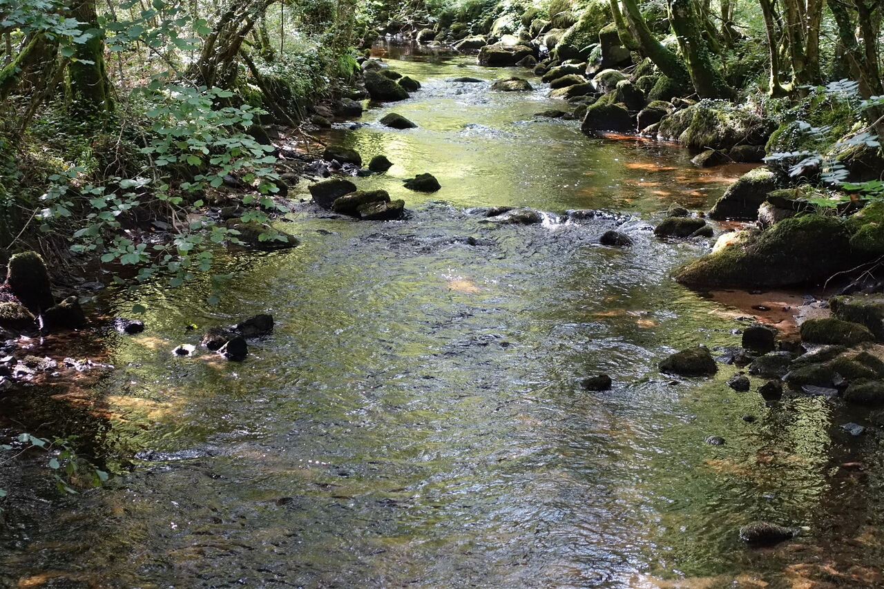 Die 04 Enclos Paroissial de Lampaul Guimillau (126 m) stammt aus dem 16. bis 17. Jahrhundert und umfasst neben der Kirche Saint-Miliau mit ihrem Glockenturm eine Grabkapelle, einen Kalvarienberg und eine Triumphpforte. Der Kalvarienberg berichtet vom Leben und der Passion Christi. Für den Rückweg gehen wir nur wenige Meter auf der Rue du Calvaire und kommen an einer Crêperie vorbei, um dann links durch die Rue des Bruyéres bis zum Kreisverkehr an der Hauptstraße vorzugehen. Diese überqueren wir geradeaus und kommen an Einfamilienhäusern vorbei, um dann in der Rechtskehre der Straße geradeaus bis zum Ende der Sackgasse zu gehen. Wir lesen aufmerksam ein Schild mit der Aufschrift "privat". Nach Rücksprache mit Office de Tourisme du Pays de Landivisiau ist dies ein offizieller Wanderweg. Daher gehen wir halb links, hinter den Gebäuden leicht bergab und bei der Weggabelung nicht scharf rechts, sondern gerade in den Wald hinein. Wir gehen nun an einem Bachlauf entlang. Im weiteren Verlauf schlängelt sich der Pfad bergauf und endet am Feldrand, wo wir rechts gehen.