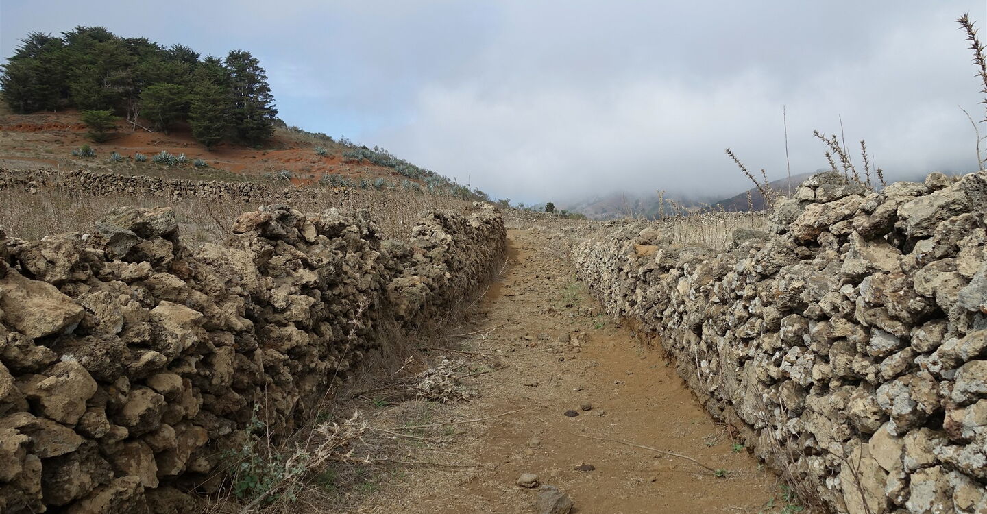 Vom (01) Start und Ziel (985 m) verlassen wir die von San Andres kommende Straße nach halb rechts. Auf der Kiefernallee erreichen wir eine Dreiwegegabelung, an der wir geradeaus weiterwandern. Wir kommen durch einen kleinen Wald, bis dann auf Höhe des rechts von uns liegenden verlassenen Bergdorfes La Albarrada der weitere Weg halb links steil bergauf führt. Nachdem die Asphaltstraße in eine Piste übergegangen ist, erreichen wir eine Anhöhe. Bei guter Sicht erheben sich die Nachbarinseln La Gomera und Teneriffa aus dem Dunst.