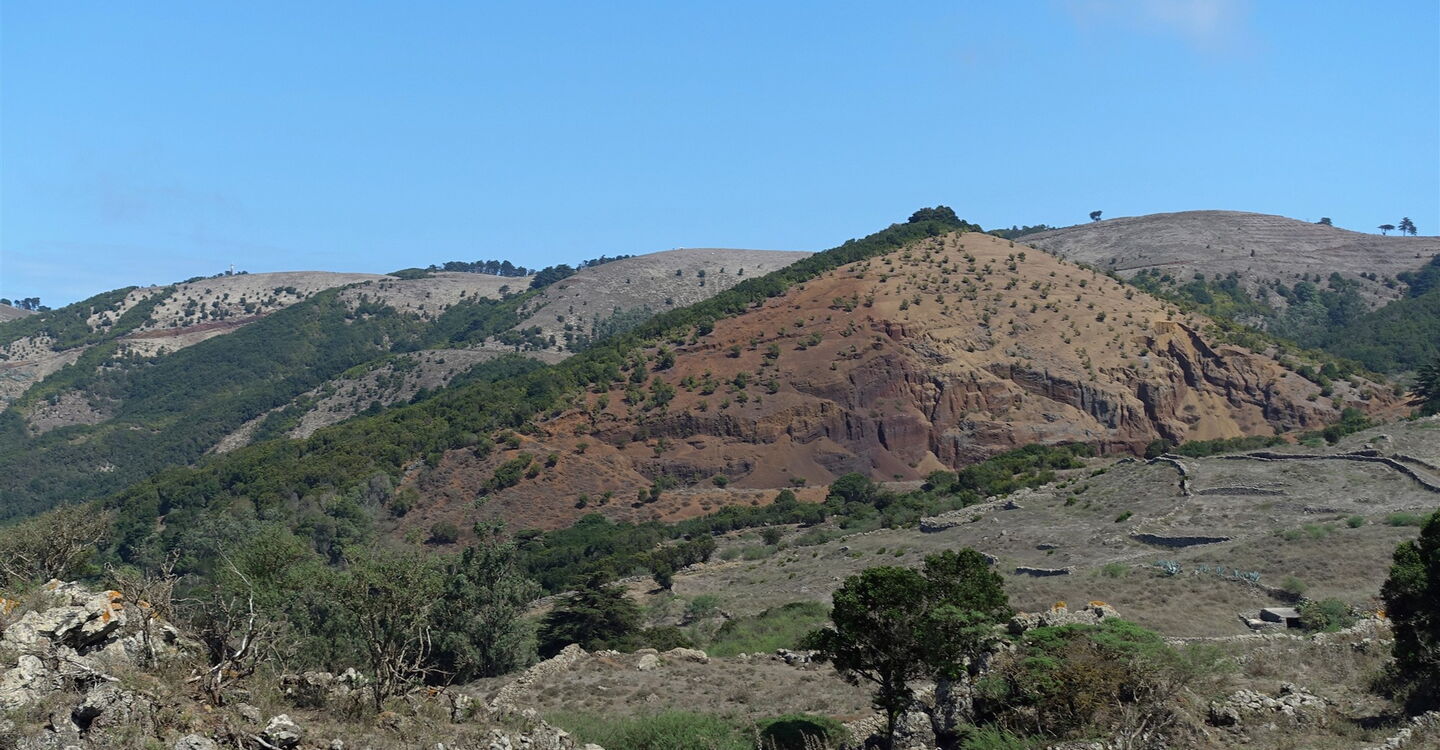 Nach insgesamt 475 m auf dieser Straße – oder 50 m hinter dem Verkehrsschild kurvige Straße – verlassen wir die (03) Straße HI-10 (819 m) nach links und wechseln auf die steil ansteigende Asphaltstraße. 100 m vor einem riesigen Eukalyptusbaum – hier steht halb links ein Wacholderbaum – gehen wir links. Hinter einem rechts liegenden Ziegengatter wird der Weg zum Pfad – im Frühjahr ist er oft stark verwachsen. Es folgt ein diffuses Wegstück. Wir passieren zwei Ziegenzäune und orientieren uns in Richtung der oberhalb liegenden Einsattelung. Bei einem Mauerdurchbruch gehen wir auf einem Trampelpfad rechts an der Mauer entlang. Wir gehen direkt auf eine weitere Mauer zu, um an dieser halb rechts vorbei auf eine etwas erhöht liegende Piste zu gelangen.
