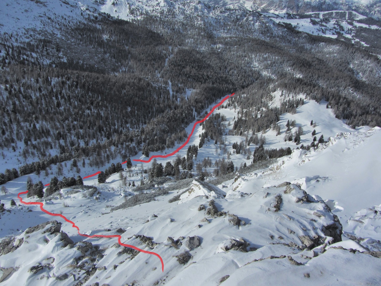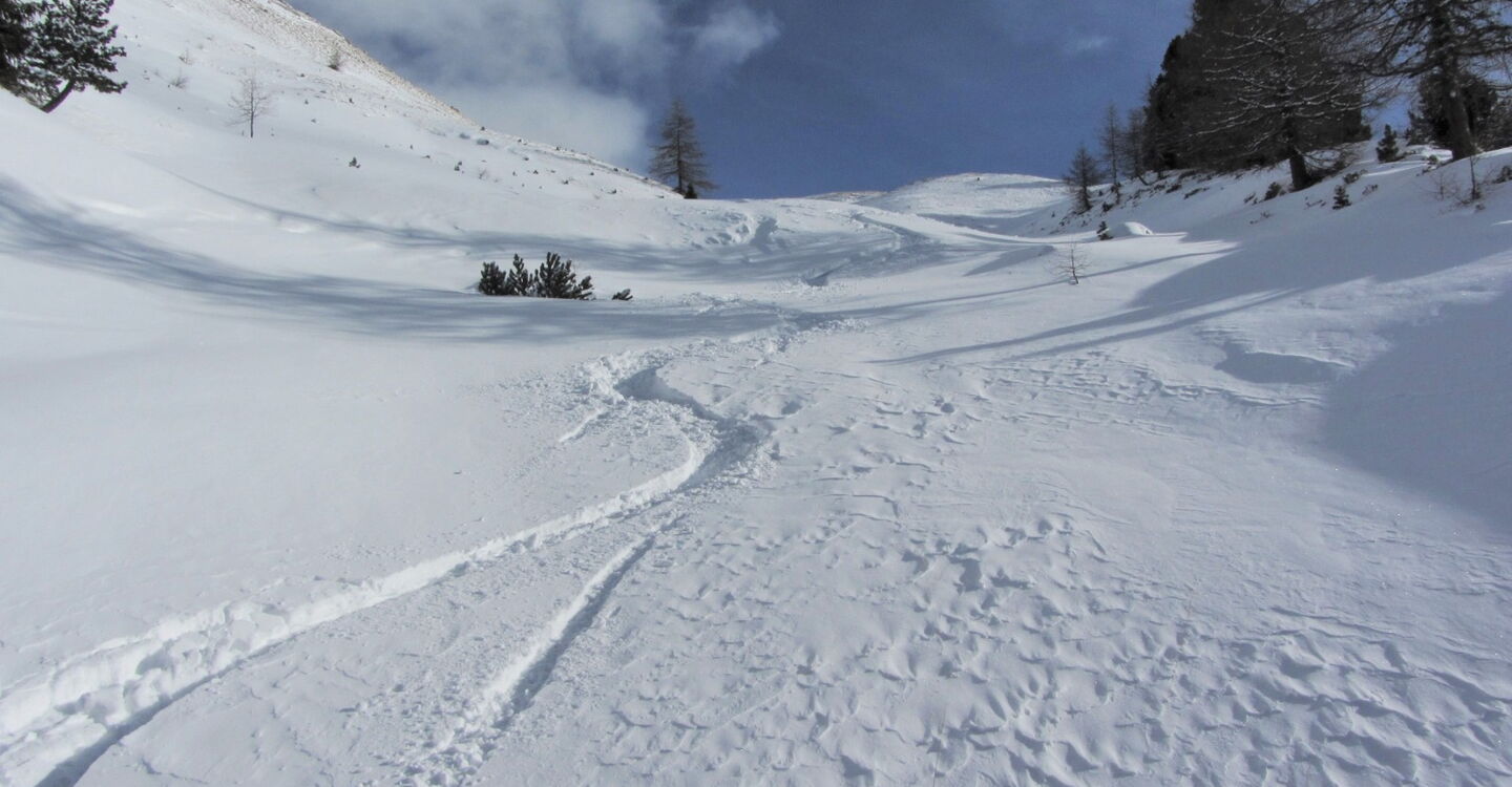 Je nach Schneebedingungen kann man mehrere Varianten nehmen, bis man automatisch in die weiße Rinne der Pra de Ciamena kommt, die bis in den Talgrund führt.