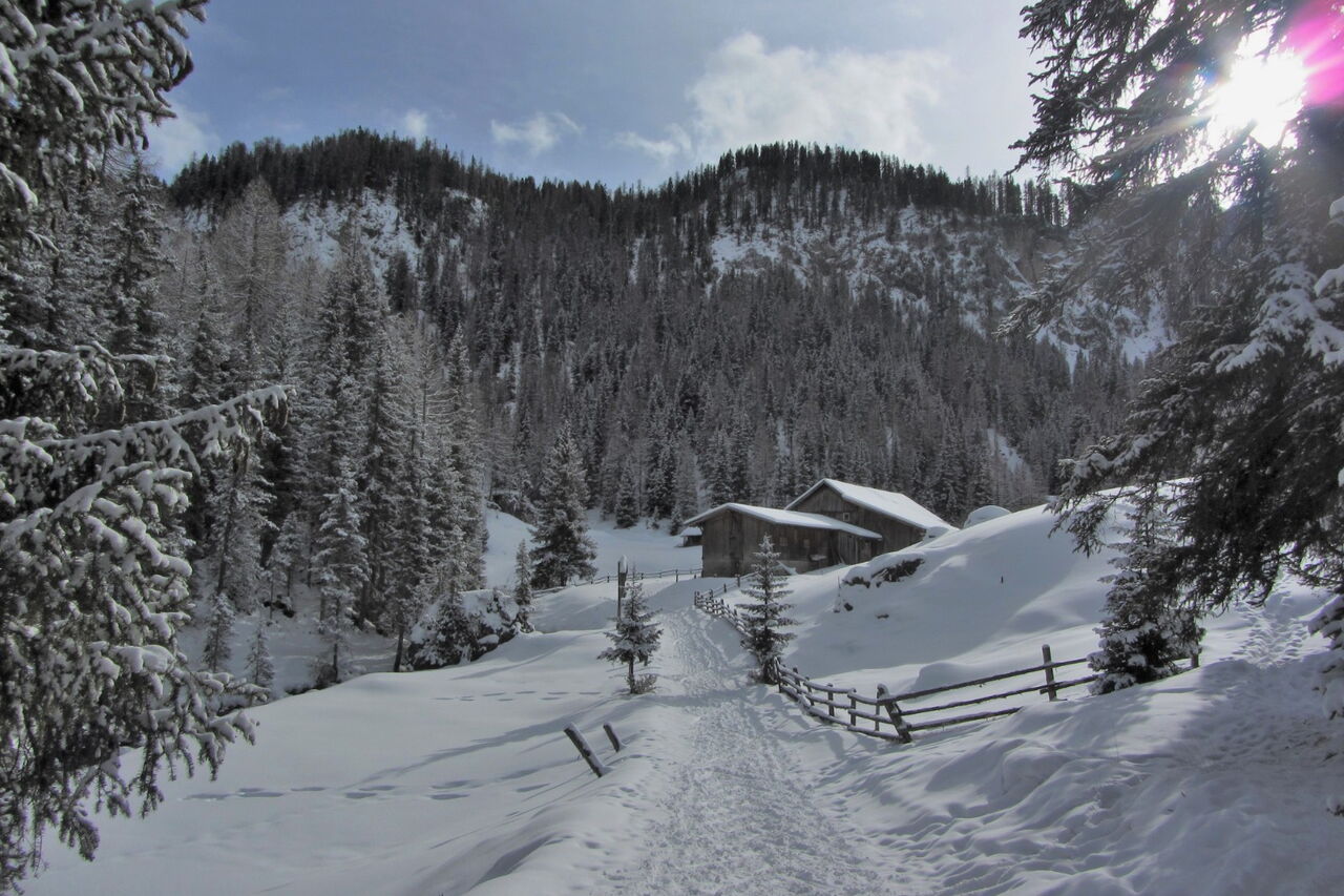 Einfache Orientierung beim Aufstieg. Im Talgrund ist es nicht so einfach, den Weg parallel zum Fluss zu finden. Die Abfahrt führt über einen Nordwesthang. Folgende Ausrüstung wird empfohlen: Produkte für alpine Sicherheit im Schnee, Freerideski und Skitourenhelm. Es empfiehlt sich die Einkehr am Ende der Tour in das Hotel Gran Ancëi. Beste Jahreszeit: Januar bis April. Uns erwarten kurze Stücke mit bis zu 35° Hangneigung.