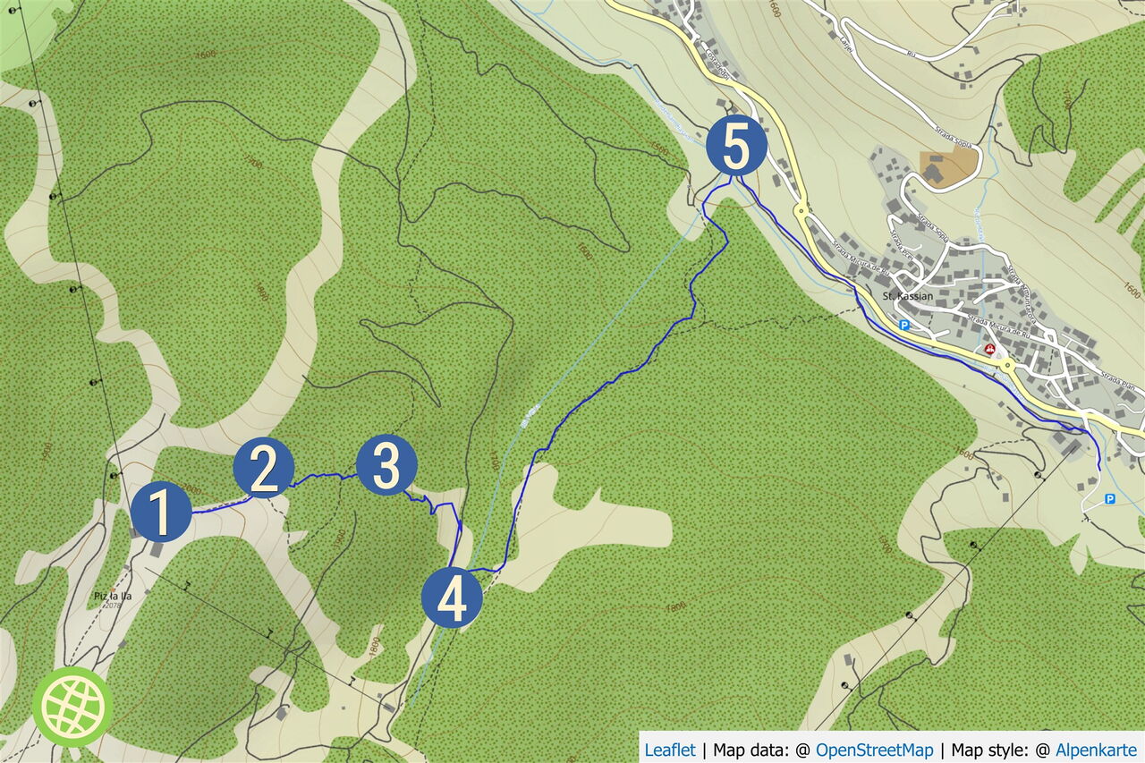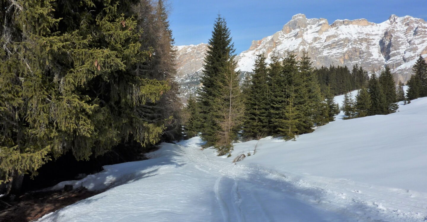 Hier kann man nach La Villa abfahren oder geht 200 m auf der Piste rechts bergauf, um dann links auf dem Wanderweg 2,5 km nach San Cassiano abzufahren. Bis zur Gondel Nr. 11 Piz Sorega kommt nun ein ca. 1 km langer Fußweg.