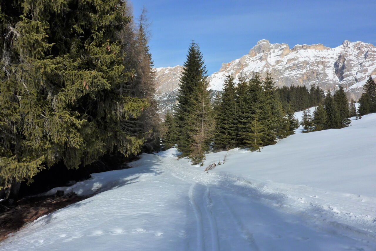 Einfache Orientierung. Man kann unter den kleinen Tannen fahren und bei genügend Schnee auch unter den großen. Die Abfahrt führt über einen Nordosthang. Folgende Ausrüstung wird empfohlen: Produkte für alpine Sicherheit im Schnee, Freerideski und Skitourenhelm. Es empfiehlt sich die Einkehr in das Rifugio Ütia Bamby an der Piste 16a. Beste Jahreszeit: Januar bis April. Uns erwarten kurze Stücke mit bis zu 25° Hangneigung.