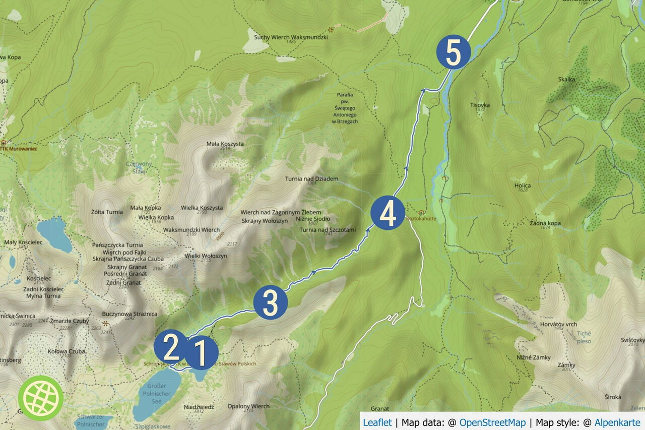 Von der 01 Fünf-Polnische-Seen-Hütte (1670 m) gehen wir in nordwestlicher Richtung auf dem blau markierten Wanderweg durch das Dolina Pięciu Stawów Polskich. Am Abfluss des Sees Wielki Staw Polski gehen wir noch vor der Brücke rechts auf dem grün markierten Wanderweg weiter.