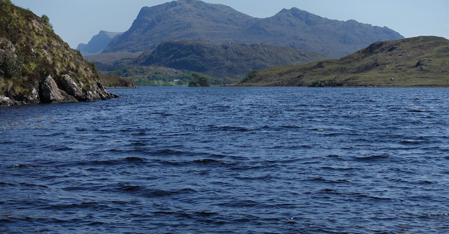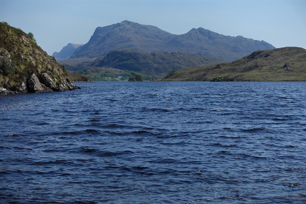 Nach kurzem Abstieg queren wir einen kleinen Bachlauf und erreichen den 03 Loch Kernsary (17 m). Der Pfad führt etwas erhöht oberhalb des Ufers entlang, so schaut man über den See bis zu den zahlreichen Gipfeln der Torridon-Berge. Zum Ende des Sees wird der Weg etwas steiniger, wir passieren ein Gatter und queren eine große Wiese mit einer Vielzahl von schönen Eichen.
