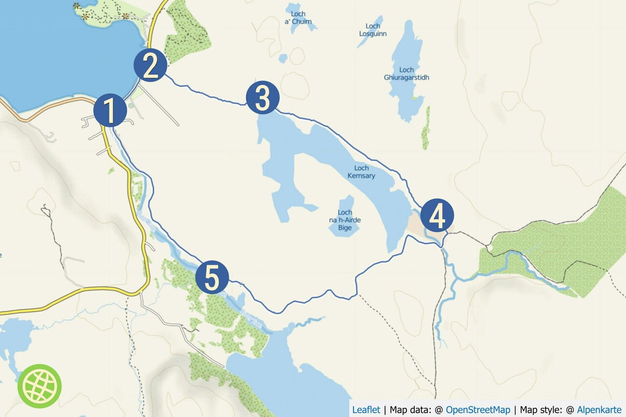 Der Hafen von Poolewe hat in seiner Geschichte immer einen hohen Stellenwert eingenommen. Ab dem 16. Jahrhundert wurde Stahl erzeugt und abtransportiert, im 18. Jahrhundert gab es hier eine Postschiffverbindung auf die Äußeren Hebriden und im Zweiten Weltkrieg diente Poolewe am Loch Ewe als Sammelpunkt für Nordmeergeleitzüge. Um Poolewe auf dem Landweg zu erreichen und mit Post zu versorgen, wurde in der Vergangenheit der sogenannte Kernsary Path bis zur Kernsary Farm genutzt. Die Wanderung führt durch seichte Hügelketten mit malerischen Aussichten über den Loch Kernsary bis zu den zahlreichen wilden Gipfeln der Torridon-Berge mit dem Beinn-Eighe-Bergmassiv. Der folgende Wegabschnitt führt durch einen schönen Wald mit Stechpalmen, Eichen und farbenfrohen Rhododendren. Das letzte Teilstück begleiten wir den Fluss Ewe auf seinem nur 1,6 km langen Weg zwischen dem Loch Maree und dem Loch Ewe – einer der kürzesten Flüsse in Schottland.