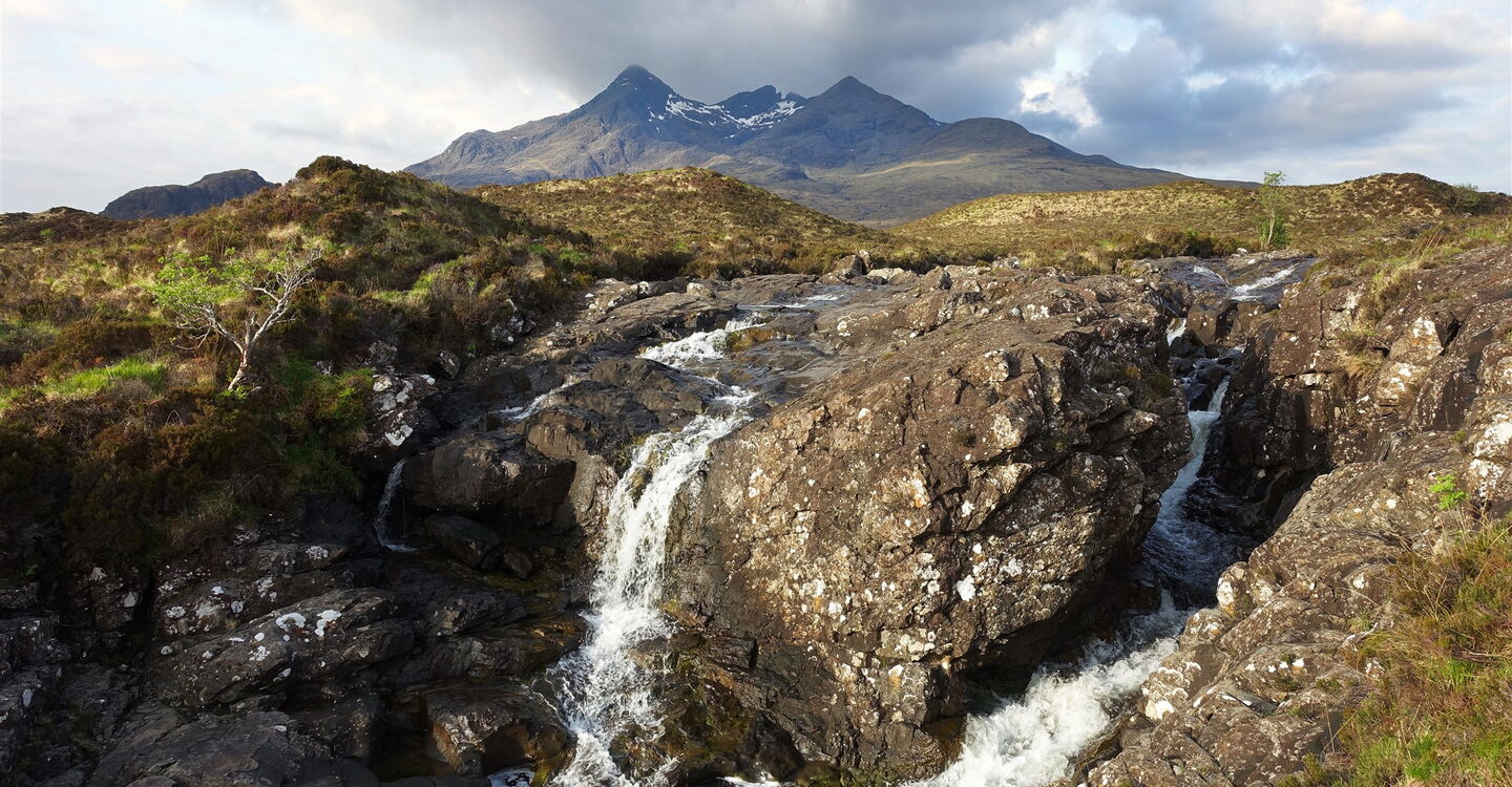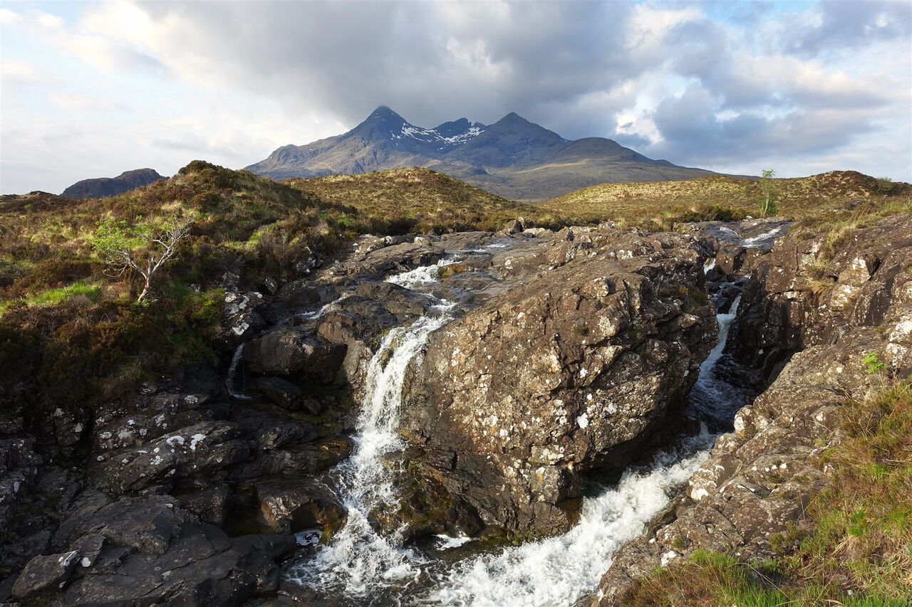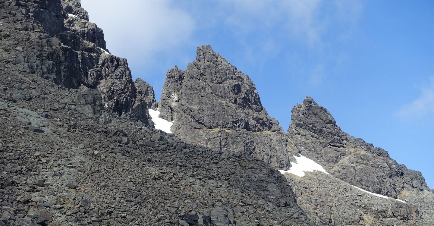 Das faszinierende und weltberühmte Bergmassiv der Schwarzen Cuillins auf der Isle of Skye wird durch die im Halbkreis angeordneten Magmasäulen mehrerer Vulkankrater gebildet. Sie bestehen größtenteils aus Basalt und schwarzem Gabbro – daher die Herleitung des Namens: Black Cuillins. Alle zwölf Munros auf Skye sind Black-Cuillin-Gipfel, mit Ausnahme des Gipfels Blabheinn – siehe Wanderung 23 –, der vom Hauptkamm getrennt steht. Der höchste und unerreichbare Gipfel ist der Sgùrr Alasdair mit stolzen 992 m Höhe, der pyramidenartige Gipfel des Sgùrr nan Gillean ist der schönste Gipfel. Die wichtigste Voraussetzung für eine erfolgreiche Besteigung ist gutes Wetter, denn sonst fehlt die Orientierung in der Steinwüste. Auch nicht zu vernachlässigen ist der finale Aufstieg zum Gipfelplateau mit dem Schwierigkeitsgrad II. Möchte man über die Pinnacle Ridge aufsteigen oder den Gipfel überschreiten und auf seiner anderen Seite absteigen, so begibt man sich in den Schwierigkeitsbereich des technischen Bergsteigens!
