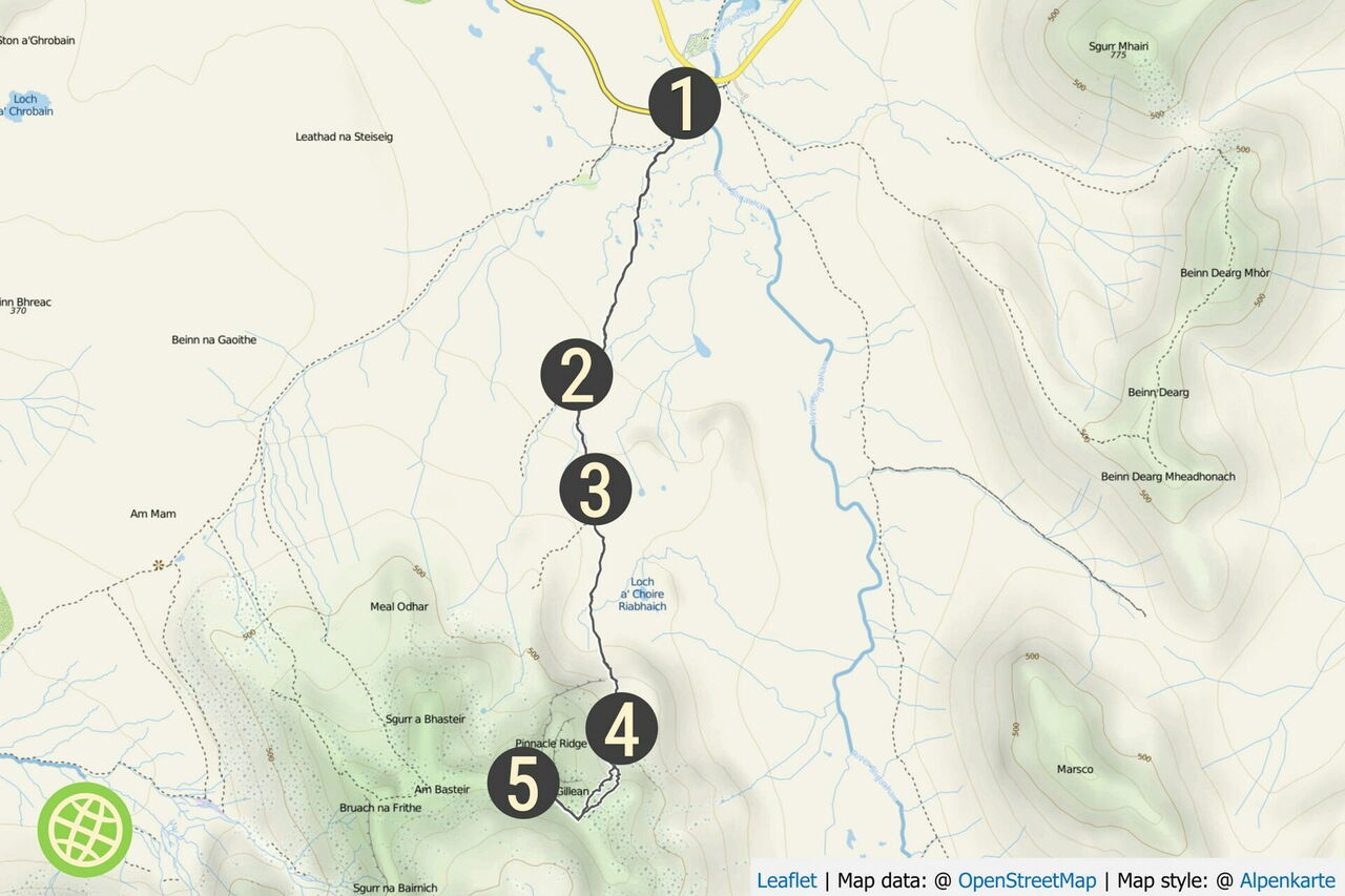 Schwere Wanderung aufgrund der steilen An- und Abstiege, oft weglos, einzelne einfache Kletterstellen sind exponiert. Art des Weges: 100 % Pfad. Zusatzausrüstung: Keine. Einkehr: Keine auf der Wanderung. Beste Wanderzeit: Mai bis September. Sehenswert Region: Eilean Donan Castle, Entfernung 54 km, Geokoordinaten 57.273906 -5.516130.
