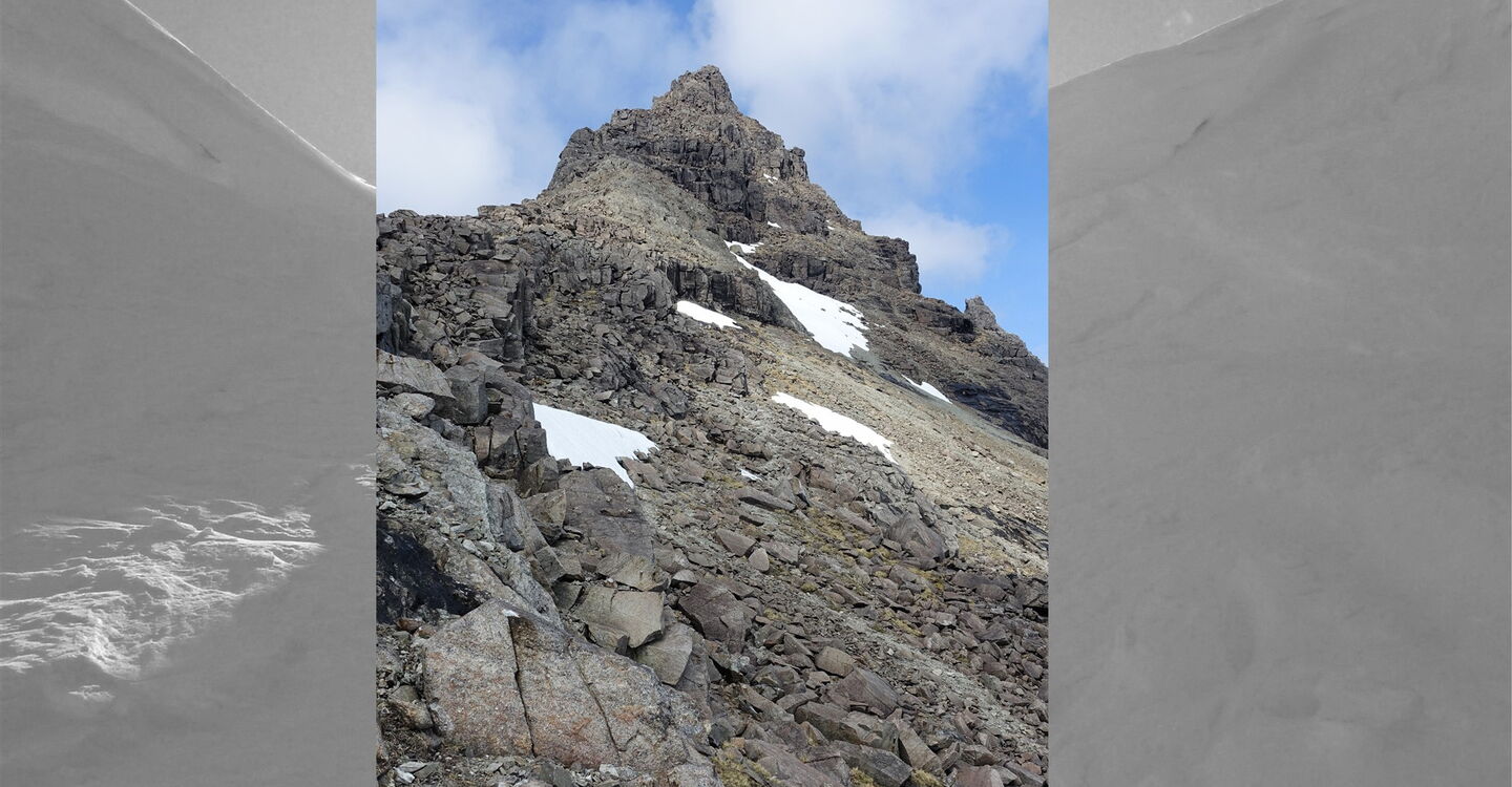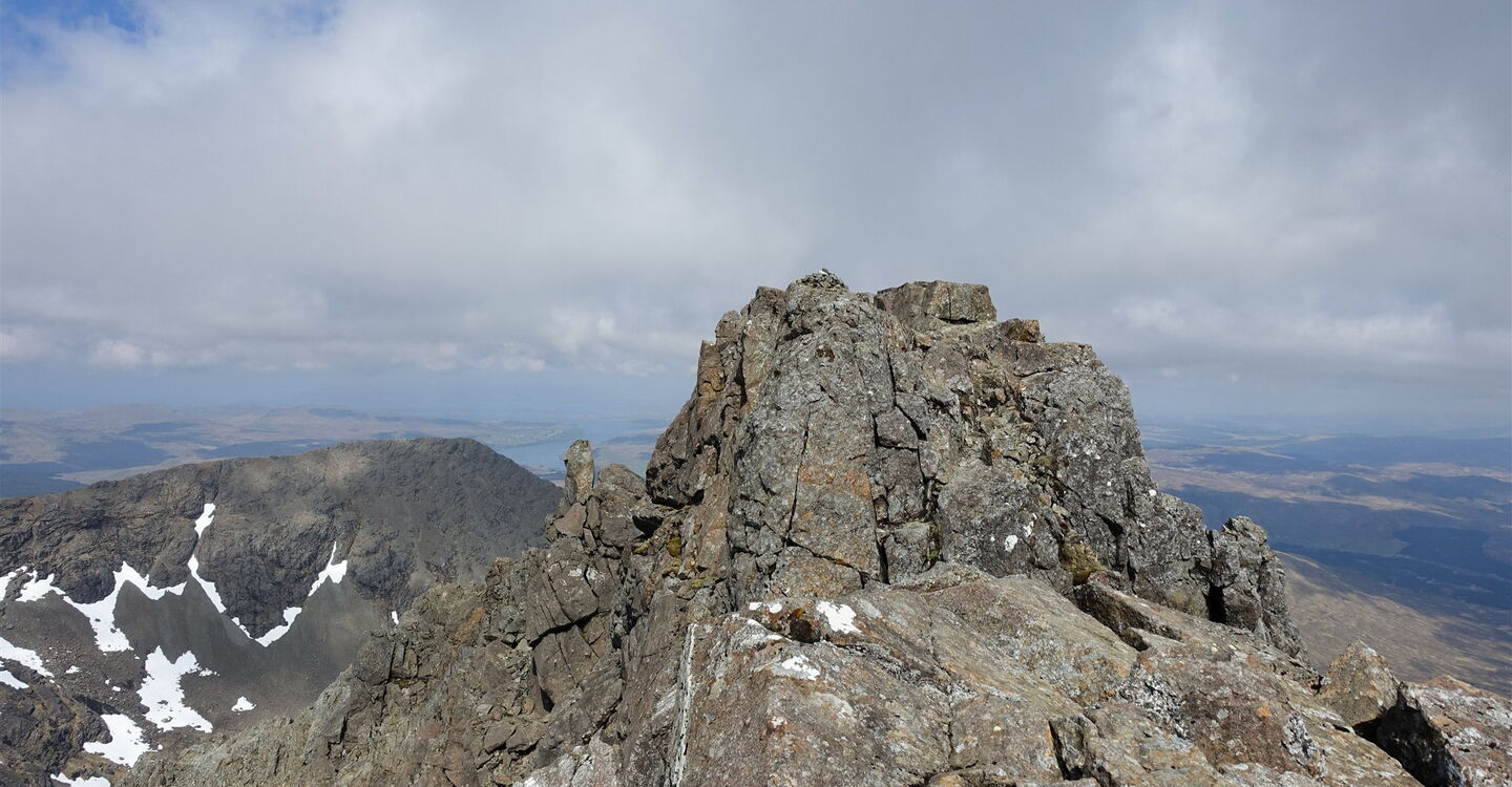 Wir erreichen den Gipfel des 04 Sgùrr Mhor (986 m). Richtung Westen sieht man über den Atlantik bis zu der Insel Skye. Richtung Nordosten kann man das Geschehen auf den Alligin Horns schon einmal beobachten und Richtung Osten thronen die benachbarten großen Gipfel. Bei schlechtem Wetter – und falls man nicht gerne klettern möchte – sollte man an dieser Stelle umkehren und die Hörner auslassen.