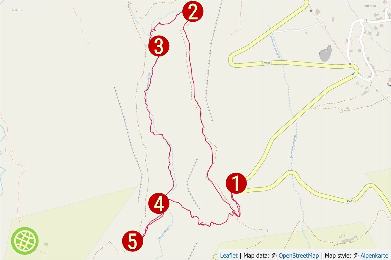Bei dieser mittelschweren Wanderung ist der Abstieg in die Schlucht nicht einfach zu finden. Der Orientierungssinn wird auch bei dem 200 Höhenmeter steilen Direktaufstieg gefordert. Art des Weges: 15 % Pfad, 35 % im Barranco und 50 % Piste. Ausrüstung: Wanderstöcke sind hilfreich. Keine Einkehrmöglichkeit weit und breit. Beste Wanderzeit: ganzjährig. Variante: Entscheidet man sich für die Variante, wie beim Wegpunkt 5 beschrieben, so beträgt die Gesamtstrecke 5,5 km, der Anstieg 198 m und der Abstieg 227 m. Durch diese Variante entfällt der extrem steile und geröllige Direktaufstieg. Hinweis: Nach starken Regenfällen oder bei zu erwartenden Gewitterschauern ist die Wanderung durch diese Schlucht aufgrund der zu erwartenden Wassermengen lebensgefährlich