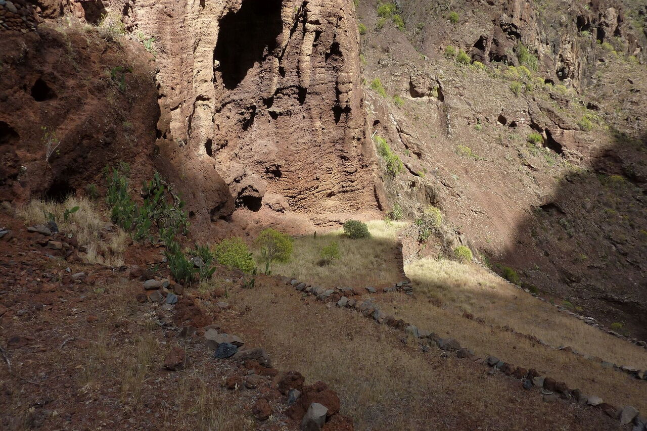 Nur wenn man sich Zeit nimmt, kann man den folgenden Wegabschnitt finden. Wir orientieren uns halb links, Richtung der unteren Steinmauer von 3 Terrassenfeldern. Weiteren Verlauf queren wir dann unterhalb einer Felswand, kurzzeitig auf einem Pfad. Es folgt ein kurzer Abstieg Richtung Barranco, bis man dann halb links auf weitere Terrassenfelder gelangt. Da sich am unteren Ende der Terrassenfelder eine unüberwindliche Abbruchkante befindet, muss man bereits am oberen Ende der Terrassenfelder rechts in das (03) Barranco (361 m) einsteigen, teilweise unter Zuhilfenahme der Hände. Während des nachfolgenden Abstiegs verengt sich das Barranco nur an einer Stelle, bei großen Felsen müssen die Hände zu Hilfe genommen werden. Die folgenden 900 m führen spektakulär durch die Schlucht.