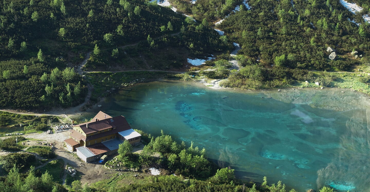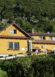 Über den Berggrat steigen wir bis zur Einsattelung ab, im Tal sieht man bereits die Chata pri Zelenom plese, direkt neben dem gleichnamigen See gelegen. Vor uns liegt ein steiler und gerölliger Abstieg. Ein Bachbett wird gequert, Sicherungsketten leiten den Wanderer durch eine rutschige Rinne. Ein weiteres Mal wird das Bachbett gequert und wir laufen nun taleinwärts bis zur 03 Chata pri Zelenom plese (1548 m).