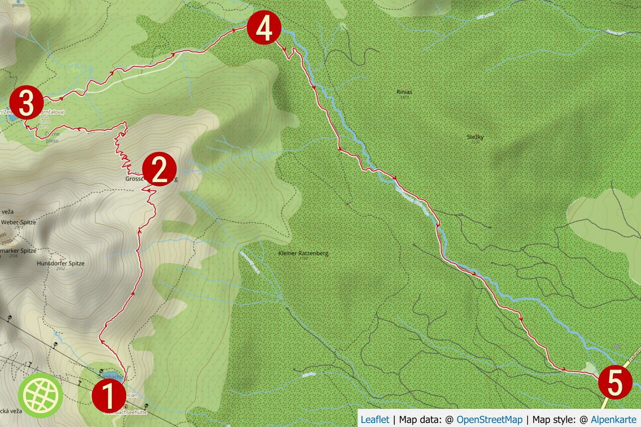 Charakter: Für die anspruchsvolle Bergwanderung benötigt man elementare alpine Erfahrung sowie Trittsicherheit und durchschnittliches Orientierungsvermögen. Art des Weges: 50 % Pfad und 50 % breiter Weg. Zusatzausrüstung: Keine. Einkehr: Km 5,8 Chata pri Zelenom plese. Beste Wanderzeit: 14. Juni bis 1. November. Hinweis: Aus Naturschutzgründen ist der Wanderweg ab Skalnaté in der Zeit vom 1. November bis 14. Juni geschlossen. Variante: Geht man vom Skalnaté pleso zur Hütte Chata pri Zelenom plese und auf dem gleichen Weg zurück, so ergibt sich eine Gesamtstrecke von ca. 10 km und 730 Höhenmetern im Anstieg und im Abstieg.