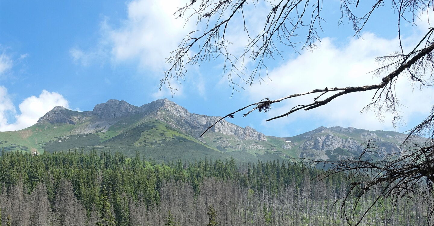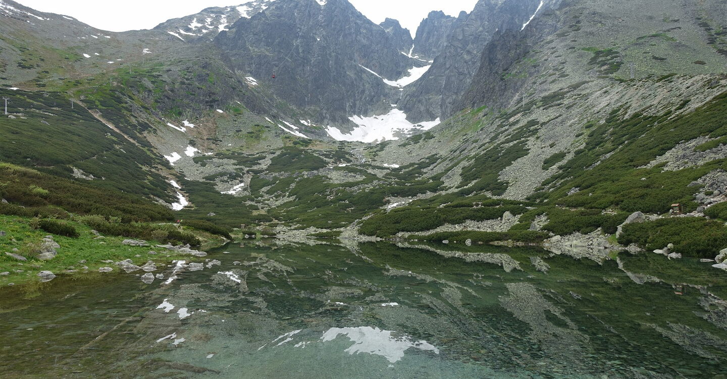 Hinter dem Gebäude der Seilbahn, die auf den Lomnický štít führt, befindet sich der See 01 Skalnaté pleso (1754 m). Dort beginnt ein Pfad entlang von Schienen, die zum Observatorium führen. Nach kurzem Aufstieg erreichen wir das Verbotsschild, das das Weitergehen in den Wintermonaten verbietet. Wir steigen entlang einer oberirdisch verlegten Stromleitung auf, um dann in einem Rechtsbogen durch Latschenkiefern zu wandern. Im Hintergrund erhebt sich die Belaer Tatra mit ihren prächtigen Wänden aus Dolomitgestein sowie den sattgrünen und steilen Grashängen.