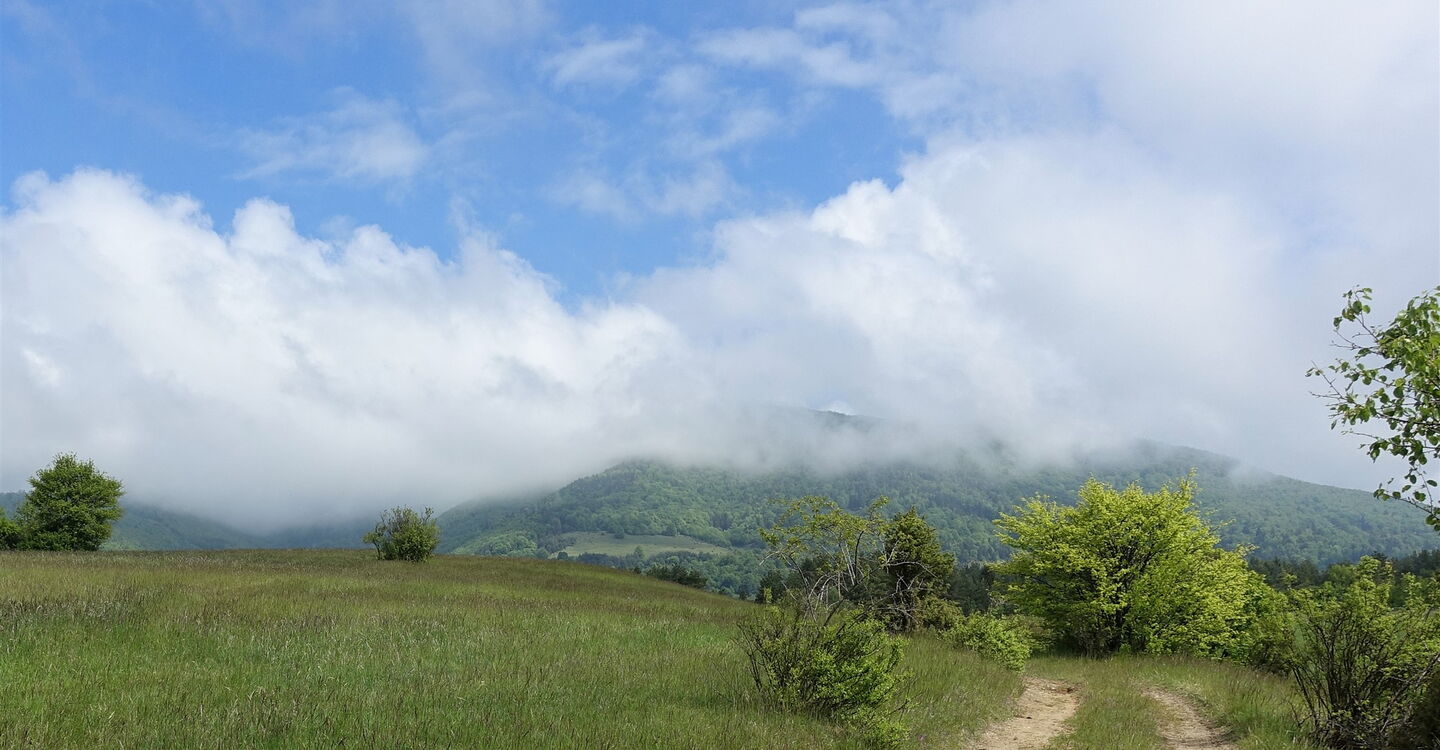 Ca. 250 m nach der Linkskehre des Weges gelangen wir in eine Senke. An dieser Stelle gehen wir nicht geradeaus unter der Hochspannungsleitung weiter, sondern biegen scharf rechts ab. Nun fast weglos geht es ca. 500 m durch ein kleines Tal, auf der linken Seite befindet sich ein Waldstück. Sobald wir auf den Feldern unterhalb einer quer verlaufenden Stromleitung angekommen sind, gehen wir in westlicher Richtung – im rechten Winkel zu der Stromleitung – auf ein oberhalb liegendes Waldstück zu. Wir queren eine Fahrspur und gehen halb rechts durch eine ca. 30 m breite Lichtung. Dann queren wir einen Wildbachlauf und gehen auf der nachfolgenden Asphaltstraße links bis zum 04 Ortsanfang von Priechod (421 m).