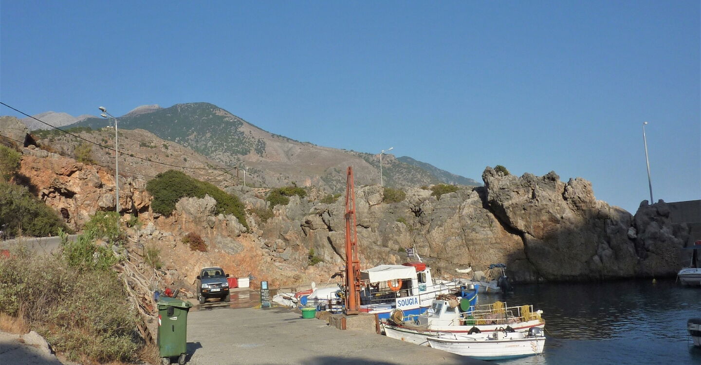 Von 01 Sougia (3,5 m) wandern wir auf der Promenade in westliche Richtung bis zum kleinen Hafen. Ein kleines Stückchen hinter der Hafenmole gehen wir über einen kurzen Strandabschnitt in die Schlucht.