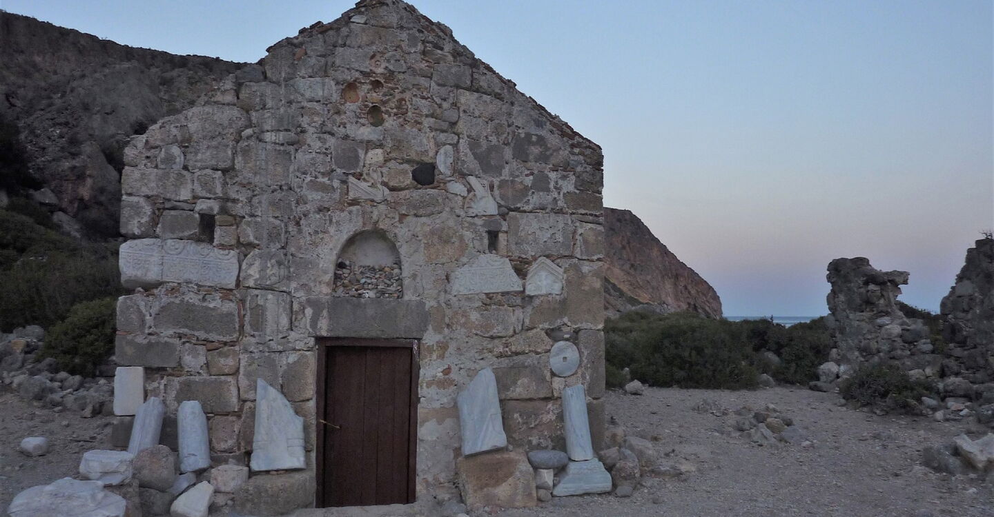 Nach 1,25 km verlässt ein Pfad nach links die Schlucht. Wir gehen über eine karge Hochebene und erreichen den Abstieg nach 02 Lissos und Agios Kirikos (2 m). Lissos war einst eine blühende antike Stadt aus der hellenistischen, römischen und byzantinischen Periode, bis es von den Sarazenen zerstört wurde. Die Bodenmosaiken des Tempels der Asklepios sind sehr gut erhalten. Auch gibt es in diesem Tal eine Quelle. Im unteren Teil des Tals befinden sich ein kleiner Bootsanleger und die Kirche Agios Kirikos. Geht man in einem großen Halbbogen durch die Schlucht, so kommt man an Prachtexemplaren von alten Olivenbäumen sowie Ruinen aus der Neuzeit vorbei. Wir verlassen die Schlucht auf einem Pfad in westliche Richtung.