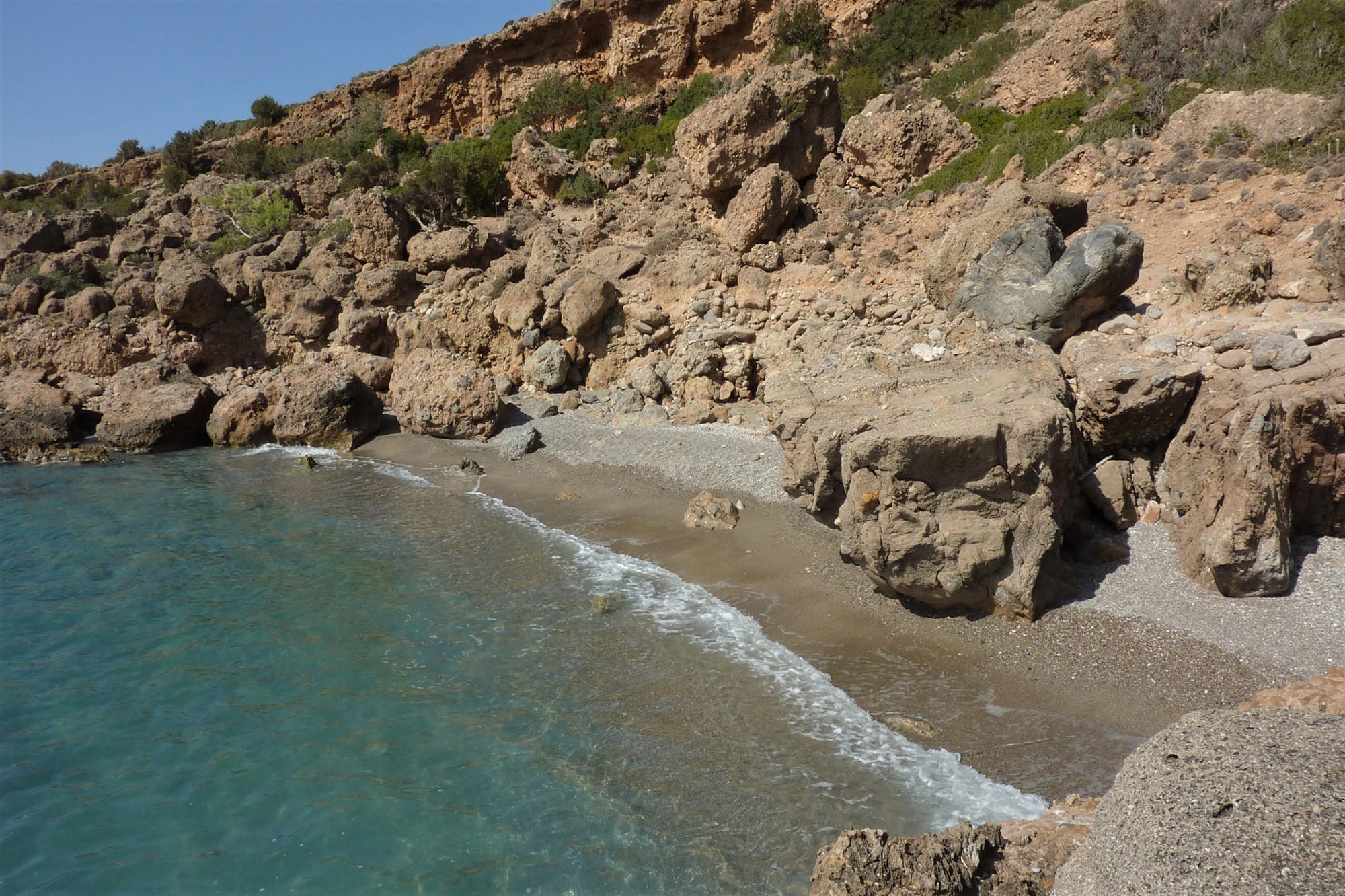 Nach weiteren 2,6 km erreichen wir den wunderschönen, aber bereits sehr touristischen 04 Astropelekita-Strand (1 m). Dieser teilt sich auf in die Strandabschnitte von Gyaniskari und Dyaliskari, die durch eine Landzunge voneinander getrennt werden. Der westliche Strandabschnitt besteht aus Kieselsteinen, der östliche aus weißem Sand.