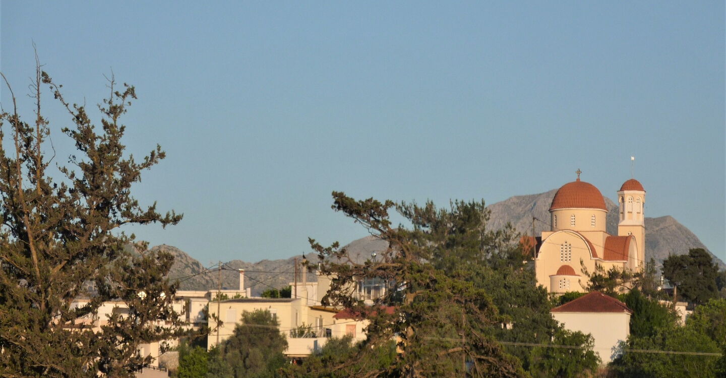 Bevor die Asphaltstraße rechts über eine Brücke weiterführt, gehen wir geradeaus auf der Piste weiter, die nur kurz später wieder in die Asphaltstraße mündet. Auf dieser gehen wir nun links und 1,5 km Richtung 05 Agkouseliana (343 m), um bei der ersten Kreuzung links zur Kirche hochzugehen. Umläuft man die Kirche auf der Asphaltstraße in nördliche Richtung, so erreicht man eine Weggabelung, rechts geht es zur Hauptstraße, links führt eine kleine Gasse zu einem Minimarkt.