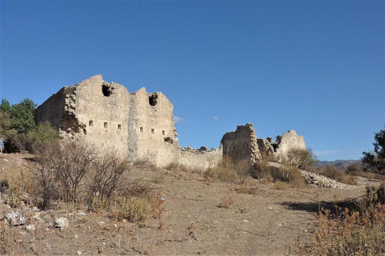 Auf dieser gehen wir 910 m rechts, um bei dem Verkehrsschild – kurvenreiche Strecke – auf der Piste links bergauf zu gehen. Wir kommen vorbei an einem Container, der Weg endet, wir gehen links und sofort wieder rechts, auch dieser Weg endet nach 130 m. Links laufen wir auf der zunächst betonierten Straße bergauf, bis wir nach 480 m den rechten Abzweiger durch das Ziegengitter zu den Ruinen des 03 Kastells Koules (368 m) nehmen. Es wurde 1866 vom osmanischen Militär errichtet und ist mit 44 x 30 m Fläche relativ groß. Es liegt erhaben auf einem Hügel, ideal, um die Umgebung und den Weg durch das Tal Richtung Südküste zu kontrollieren.