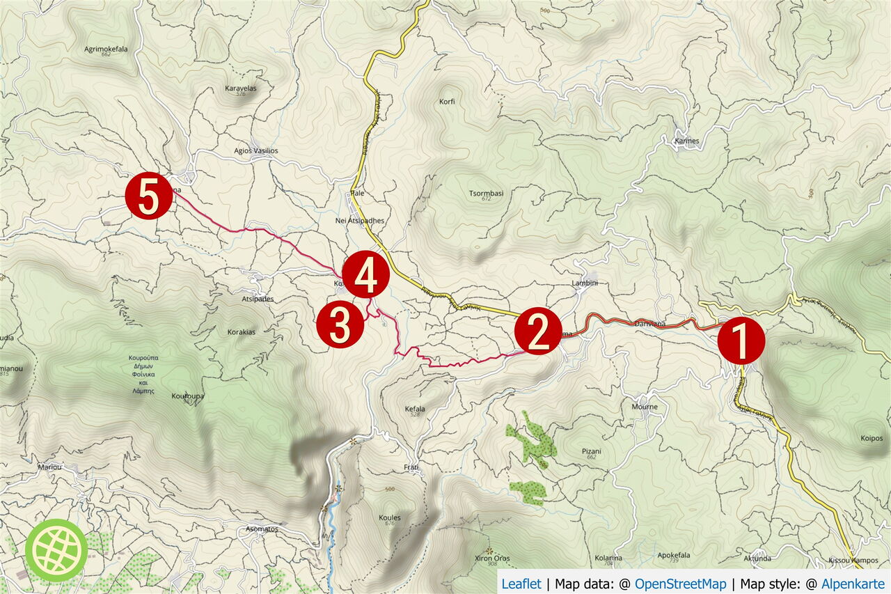 Leider muss das erste Wegstück auf der Hauptstraße gelaufen werden, selbst nach langer Recherche ließ es sich nicht vermeiden. Umso naturnaher wird aber der restliche Weg. Zwischen den Atsipadiana-Bergen und den Bergen von Kouroupas laufen wir in einer fruchtbaren Landschaft durch den Talkessel von Koxare. Beim Erkunden der denkwürdigen Ruinen des Kastells Koules kommt Spannung auf, wenn man durch ein Torhaus in den fast quadratischen Innenhof gelangt. Bei dem nachfolgenden Weg durch wildromantische Olivenhaine ist die Unruhe des Morgens dann definitiv vergessen.
