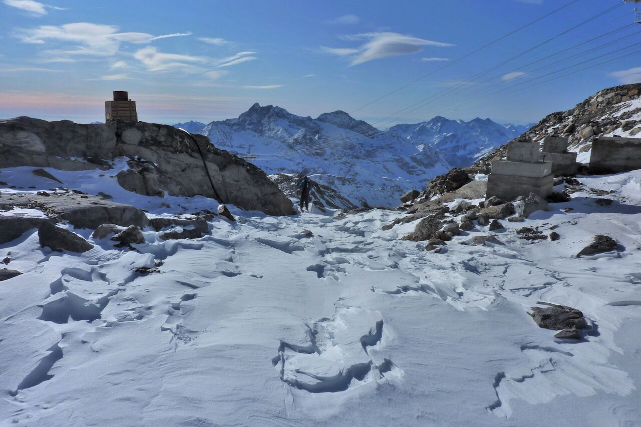 Bei der Bergstation der Seilbahn Nr. 26 Passo dei Salati Indren fahren wir gleich rechts, aber nicht unter der Seilbahn hindurch. Nach 600 m umfahren wir rechts einen gefrorenen Gletschersee.