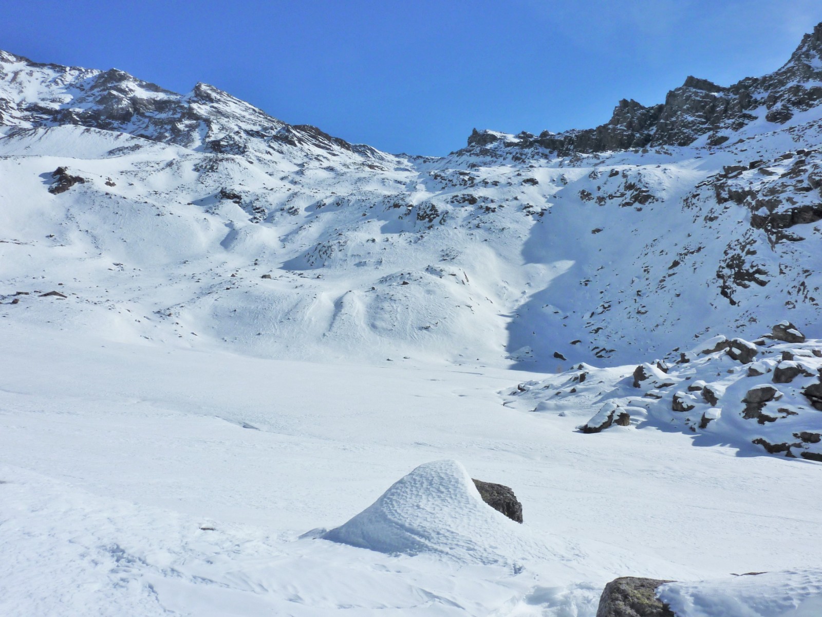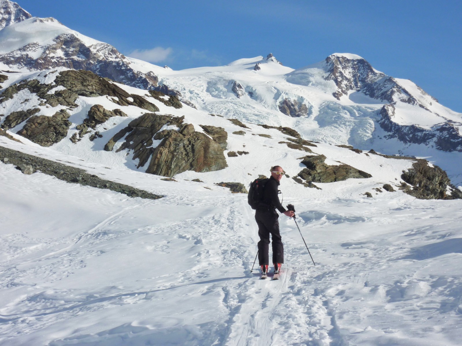 Nach einer Pause am Pass mit grandiosem Ausblick auf die umliegende Bergwelt folgt eine rasante Abfahrt auf weiten und unberührten Hängen, bis wir eine Endmoräne rechts liegen lassen.