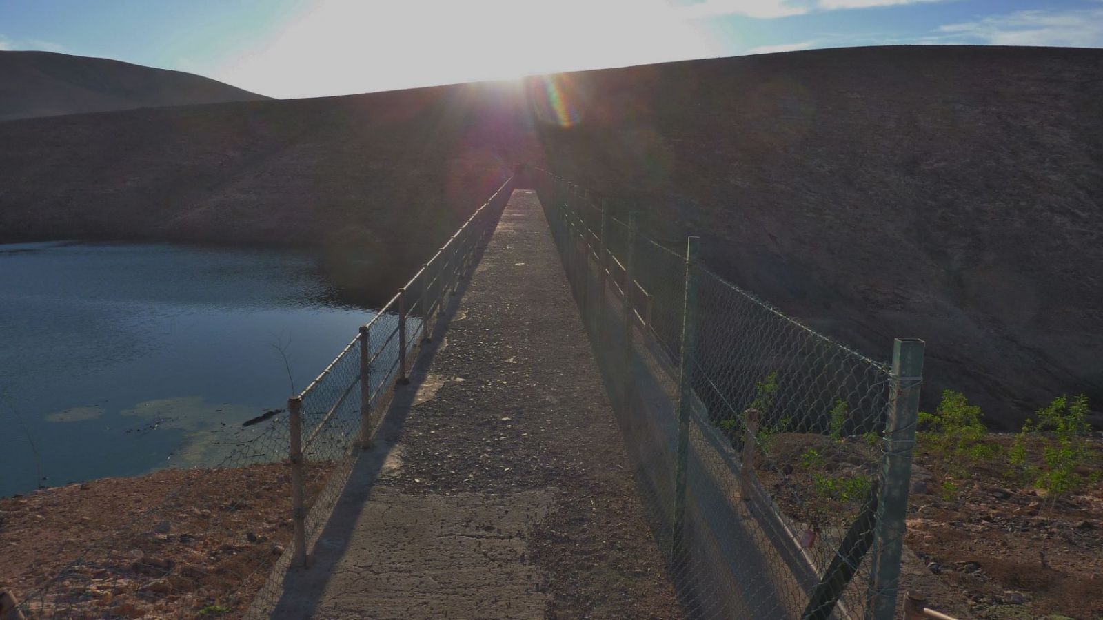 Wir wandern immer in gleichmäßigem Abstand zum Wasserspiegel des Staudammes. Schon bald ist der Staudamm auszumachen. Über die (03) Dammkrone (136 m) erreichen wir das gegenüberliegende Ufer. Neben einer Ruine und einem fest installierten Fernglas gibt es Sitzmöglichkeiten. Hinter der Dammkrone beginnt der Flusslauf des Barranco de Los Molinos, der sich bis Puertito los Molinos am Atlantischen Ozean herunterschlängelt.