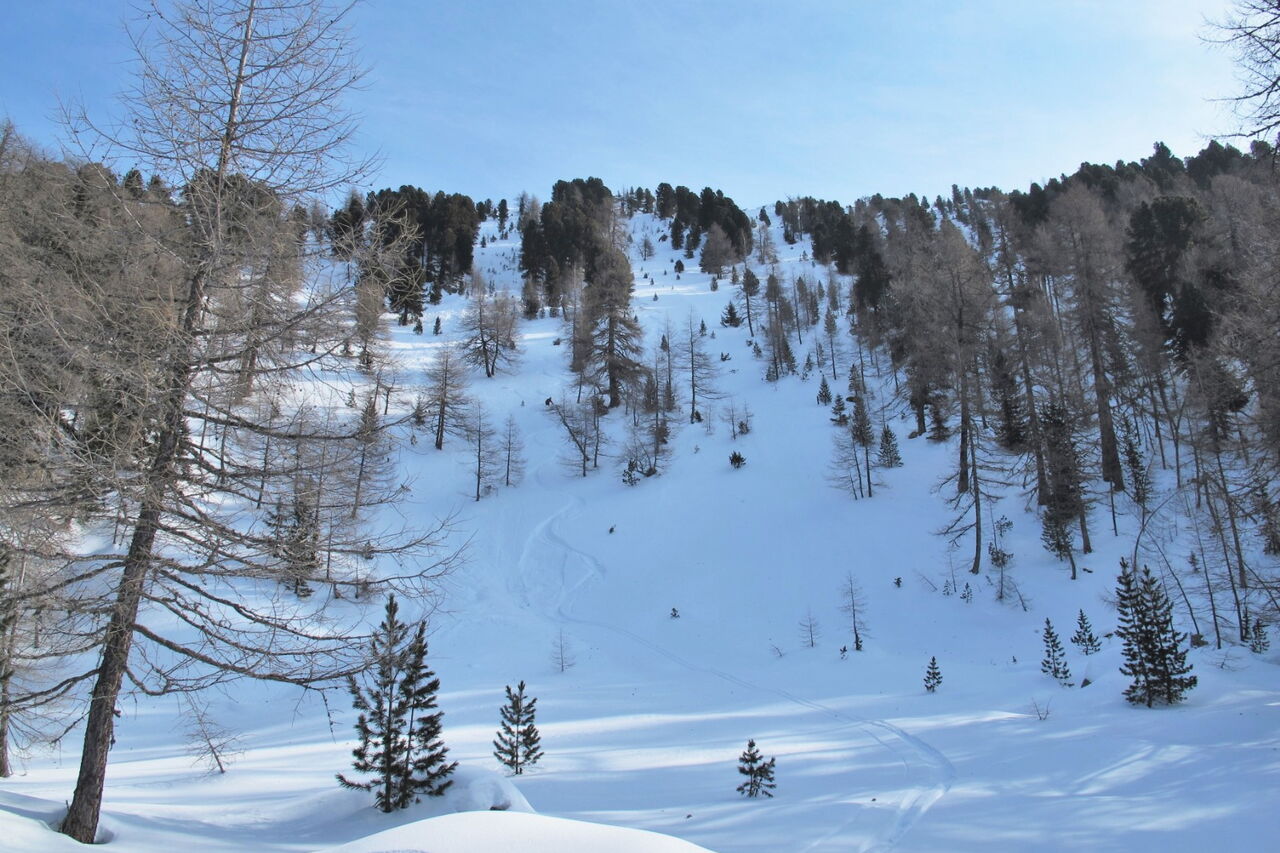 Der Aufstieg ist einfach zu finden. Aber auf der Abfahrt gibt es viele Abzweiger, die beachtet werden müssen. Die Abfahrt führt über einen Nordwesthang. Folgende Ausrüstung wird empfohlen: Produkte für alpine Sicherheit im Schnee, Tourenski und Skitourenhelm. Es gibt keine Einkehr auf der Tour. Beste Jahreszeit: Januar bis April. Uns erwarten kurze Stücke mit bis zu 35° Hangneigung.
