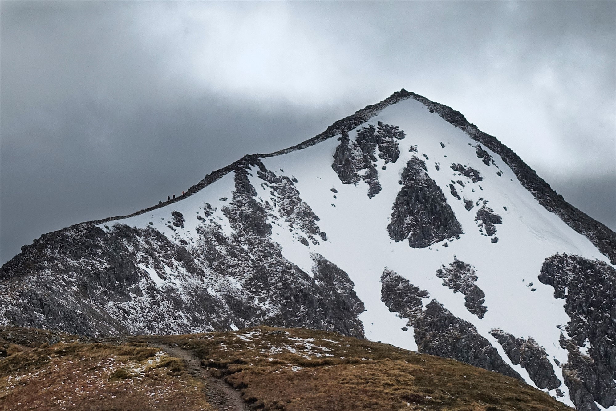 Auf dem grasigen Untergrund ist der Pfad kaum auszumachen, die Orientierung bleibt aber einfach, da wir mittig auf dem Bergrücken steil aufsteigen. Auch auf dem nachfolgenden Schotterfeld erfolgt der Aufstieg weglos, einige Steinmännchen sind nicht hilfreich. Wir erreichen einen ersten Vorgipfel, der durch einen Steinhaufen markiert ist, beim zweiten Steinhaufen haben wir den Gipfel des 03 Stob Dubh (958 m) erreicht. Mindestens 20 weitere Gipfel (Munros) sind in Sichtweite und es folgt eine astreine Gratwanderung.