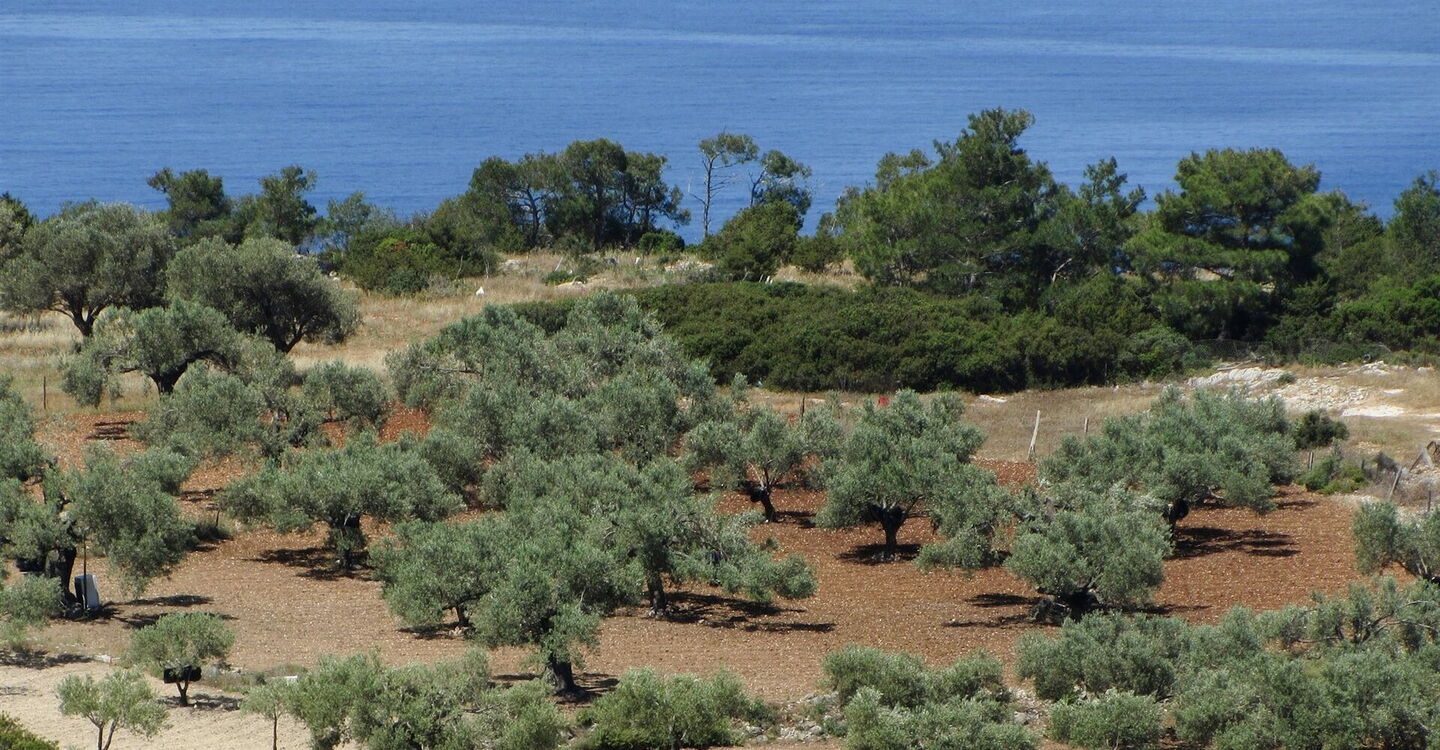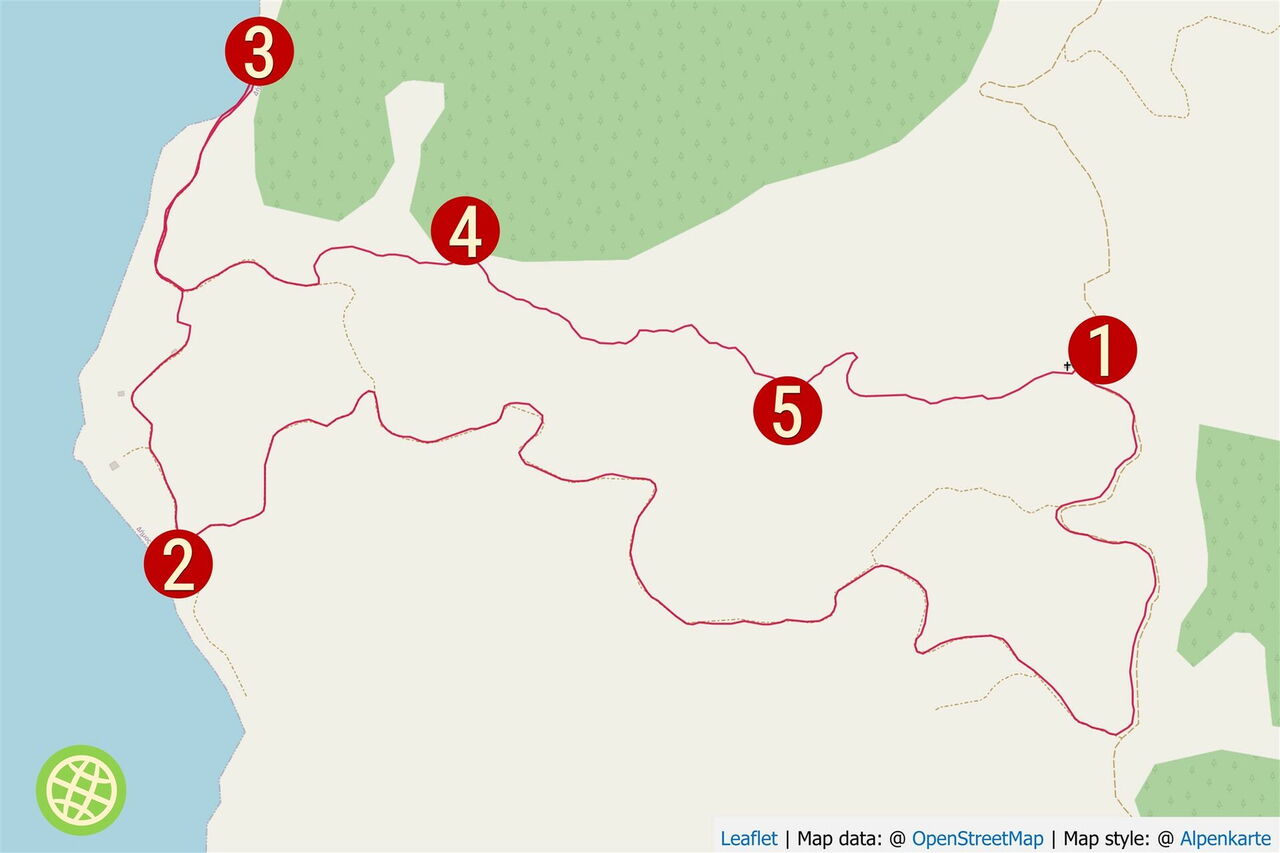 Vom (01) Start und Ziel (247 m) gehen wir auf der Anfangsstraße zurück in das Hochtal mit seinen Weinreben und Olivenbäumen. Vorbei geht es an einem Steinhaus, bis wir nach einem kleinen Anstieg an der Weggabelung rechts bergab Richtung Meer gehen, abzweigende Wirtschaftswege ignorieren wir.