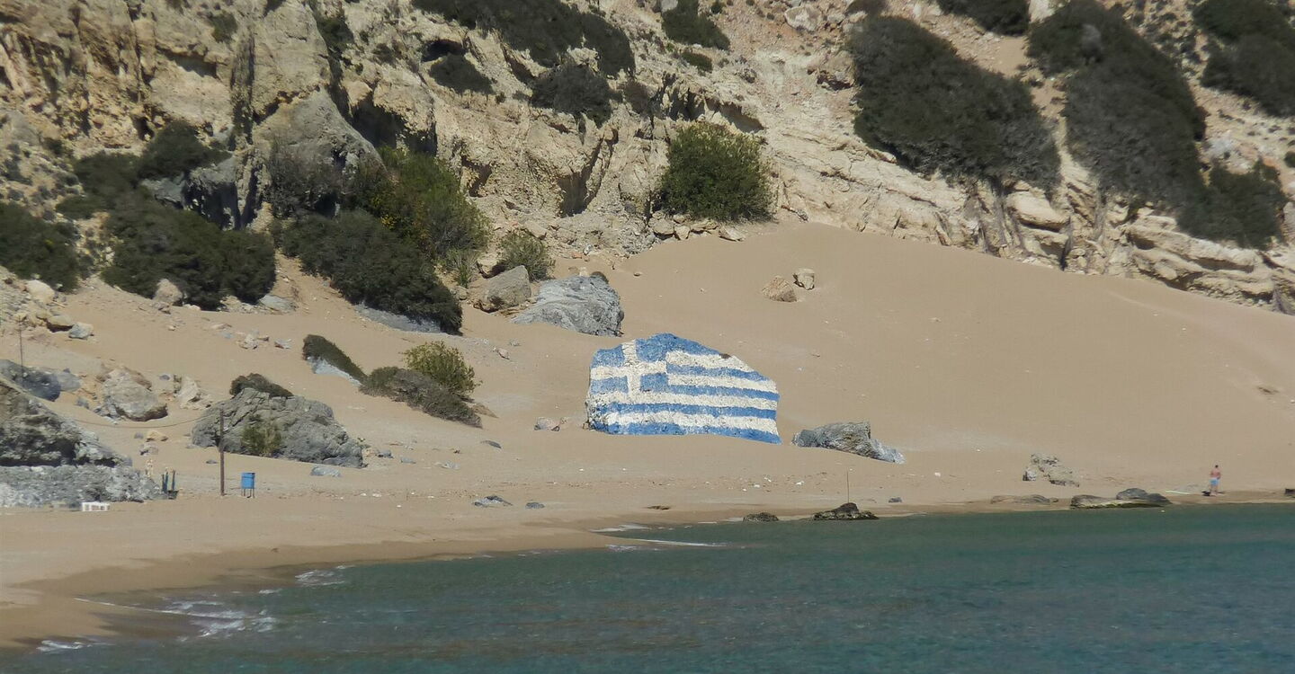 Wir gehen am (01) Strand von Tsambika (2 m) in Richtung des großen Steins, der mit der griechischen Flagge bemalt ist. Der folgende Aufstieg stellt die schwierigste Passage der Wanderung dar. Zunächst steigen wir über die dahinter liegenden Dünen zu einem Oleanderbusch auf, der auf einem Hügel steht. Direkt dahinter steigen wir unter Zuhilfenahme der Hände in einer Erosionsrinne auf, bis wir auf einen im Hang quer verlaufenden Pfad treffen. Viele Pfade erschweren die Orientierung. Wir halten uns in Richtung des Kaps, bis wir links oberhalb eine Höhle ausmachen können. Bei einem Steinmännchen unterhalb der Felsen machen wir eine 180°-Kehrtwendung, klettern abermals unter Zuhilfenahme der Hände durch eine kleine Rinne und treffen auf den Wanderpfad. Immer den Steinmännchen folgend, steigen wir nun zu einer Einsattelung auf.