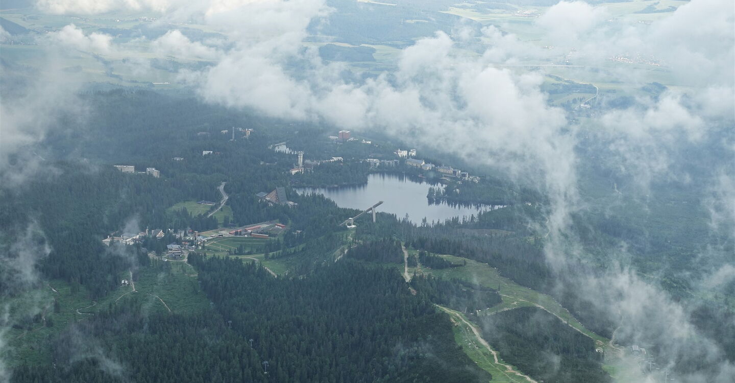 Wir erreichen die Wegekreuzung 05 Škutnastá poľana (1710 m), gehen ein langes Wegstück links bergab und folgen der Ausschilderung Richtung Štrbské Pleso. Zwischenzeitlich kommen wir an einer einzelnen Hütte vorbei. Unser Pfad mündet in einen Karrenweg, dem wir links bergab folgen. Fast auf gleicher Höhe sehen wir die große Sprungschanze. Einen nach links abzweigenden Pfad zum unterhalb liegenden See ignorieren wir und bleiben auf dem breiten Karrenweg. Auf der nachfolgenden Straße gehen wir dann an der Rückseite des Hotels Solisko und des Hotels Kempinski vorbei und erreichen an einer gepflasterten Straße rechteckige Apartmenthäuser. Nach rechts führt ein blau markierter Treppenweg herunter in den Ort und weiter zum Bahnhof.