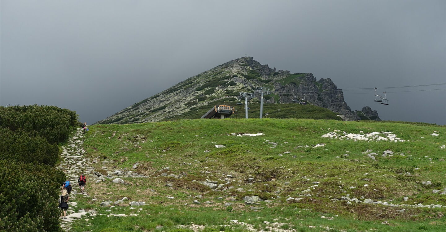 Der Pfad durch den Wald führt direkt unterhalb der großen Sprungschanze entlang, bis wir dann auf die Liftspur eines Schlepplifts gelangen. Kurz später gehen wir dann auf dem Pfad – im Winter eine Skipiste – parallel zum Schlepplift. An dieser Stelle wurde 1943 der erste Schlepplift der Hohen Tatra gebaut! Ein mit Steinen verlegter Pfad führt nun mittig zwischen zwei Sesselliften bis zur 03 Chata pod Soliskom (1840 m).