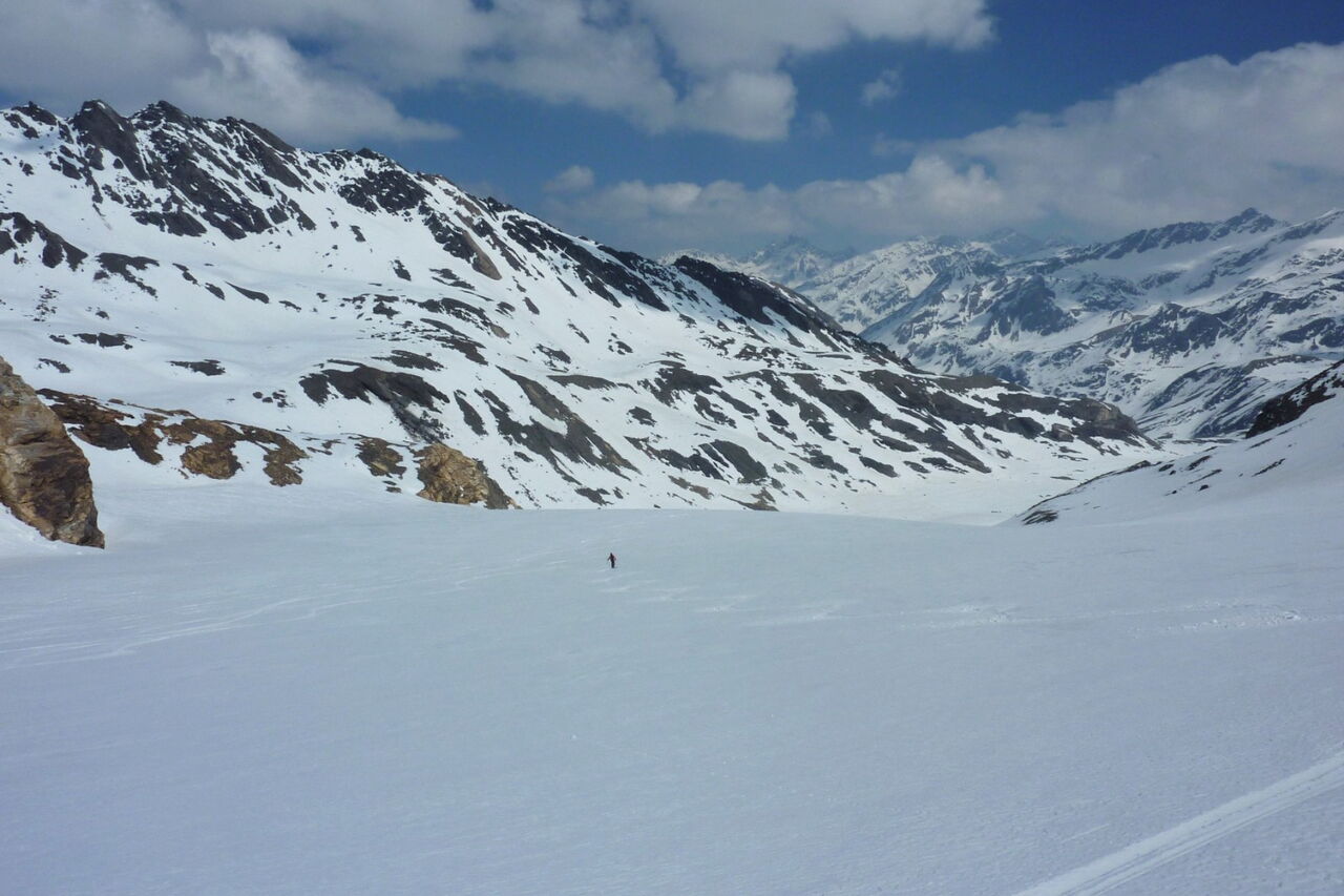 Schwerer Aufstieg zum Eisseepass und weiter zur Eisseespitze. Die Abfahrt ist einfach bei guter Orientierung. Die Abfahrt führt über einen Südosthang. Folgende Ausrüstung wird empfohlen: Produkte für alpine Sicherheit im Schnee, Klettergurt mit Kletterseil, Steigeisen, Tourenski und Skitourenhelm. Es gibt keine Einkehr auf der Tour. Die erste Hütte auf der Tour ist die Zufallhütte im Martelltal. Beste Jahreszeit: Januar bis April. Uns erwarten kurze Stücke mit bis zu 40° Hangneigung.