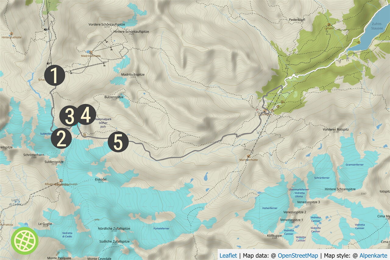Geokoordinaten zum Start 46.51565 10.596167. Sie führen Dich nach Sulden zur Seilbahn, wo Du das Auto parkst und den Lift nimmst.