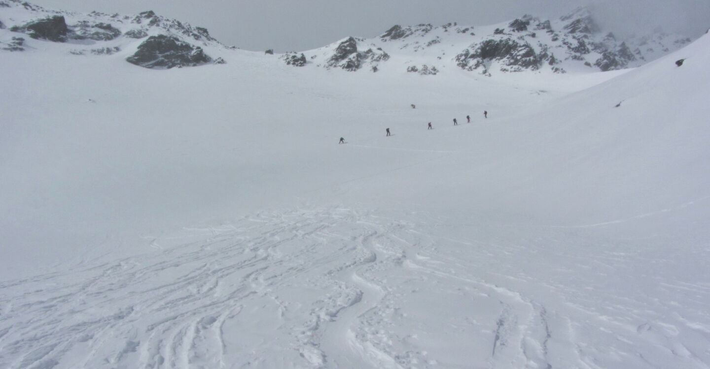 Vor uns liegen 450 hm Abfahrt. Bei Wegpunkt 3 ziehen wir die Felle auf und gehen westlich in Richtung Madritschspitze. Auf unserer Tour kam völlig unerwartet ein sehr starker Sturm auf.
