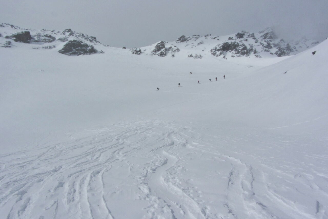 Plötzlich hatten wir einen Wolkendeckel ab 2.900 m und eine damit verbundene sehr schlechte Sicht. Die 60 cm Neuschnee vom Vortag wurden innerhalb kürzester Zeit irgendwohin verfrachtet.