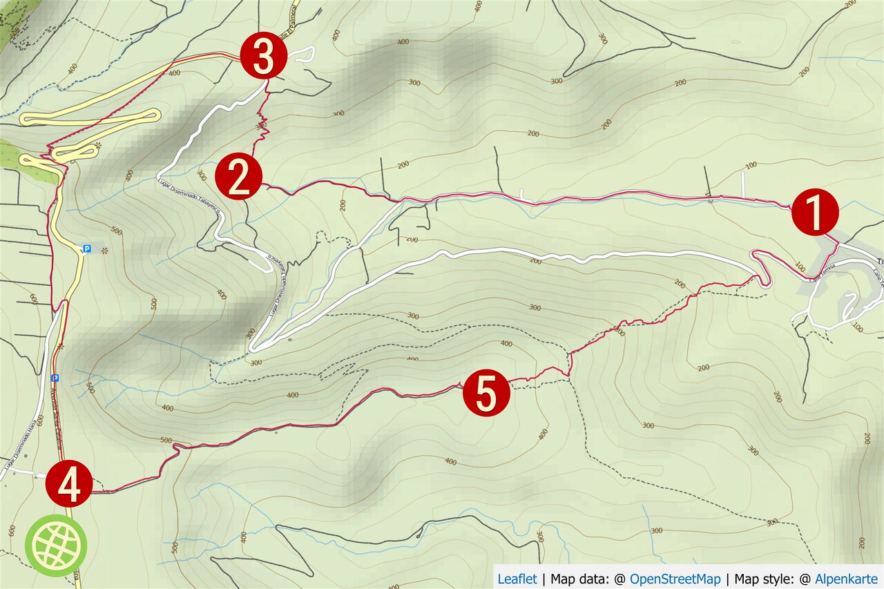 Kurz hinter einer Anhöhe erreichen wir eine (05) Schlüsselstelle (450 m). 150 m nach unbewirtschafteten Feldern, direkt nach einer Links-rechts-Kehre, verlassen wir den Weg bergab und gehen weglos parallel zu einer Steinmauer, bis wir in der Entfernung eine alte Ruine als nächsten Wegpunkt ins Visier nehmen. Durch starke Regenfälle ist der Pfad dermaßen erodiert, dass man ihn nur schwer ausmachen kann. Weiterhin weglos gehen wir nun immer mittig über dem vor uns liegenden Bergkamm, bis wir die Asphaltstraße als nächsten Orientierungspunkt nutzen. Dort angekommen, gehen wir rechts in den Ort hinein, um dann links zum Parkplatz oder geradeaus zur Bushaltestelle zu gehen.