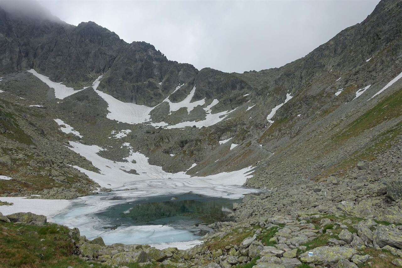 Nach abermals steilem Aufstieg erreichen wir ein mit Schutt bedecktes Tal, in dem sich ein weiterer See befindet, der an mehr als 270 Tagen im Jahr mit Eis bedeckt ist. Durch dieses Kar steigen wir bis zu einer Weggabelung mit Wegmarkierungen auf. Dort wandern wir halb rechts auf dem mit Holztreppen gesicherten Pfad bis zur Einsattelung 03 Poľský hrebeň (2200 m) weiter. Danach geht es über blanke Felsen auf einem mit Ketten gesicherten Abschnitt talwärts, mehrmals müssen die Hände zu Hilfe genommen werden. Dies ist die technisch schwierigste Stelle der Wanderung. Bis Mitte Juni steigt man ein kurzes Stück über Restschneefelder ab. Da in der Regel die Spur sehr ausgetreten ist, benötigt man aber keine Steigeisen.