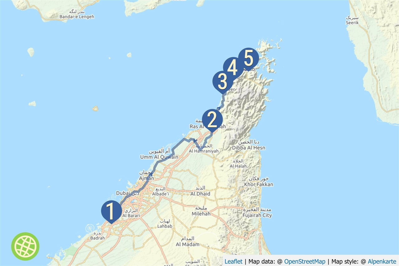 Mit Hilfe des Garmin-Navi fahren wir vom Hotel Holiday Inn Express bei N25 06.254 E55 09.974 zum Hotel Atana Musandam bei N26 12.083 E56 15.032.